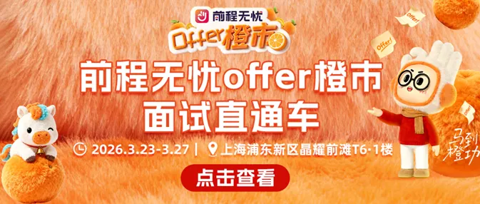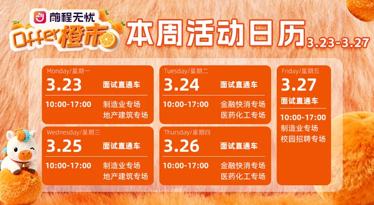 3月23日到3月27日,#前程无忧offer橙市,每天两个行业专场,制造业、金融、快消、医药、地产建筑、校园招聘……HR就在现场,简历当面看,问题当面问。