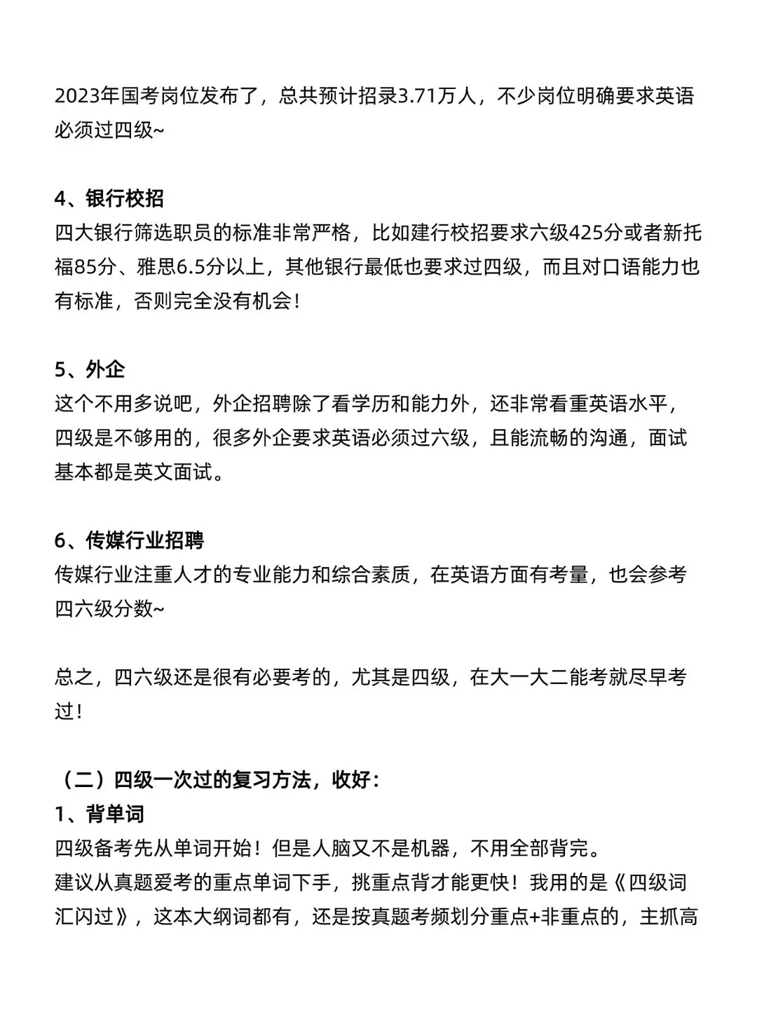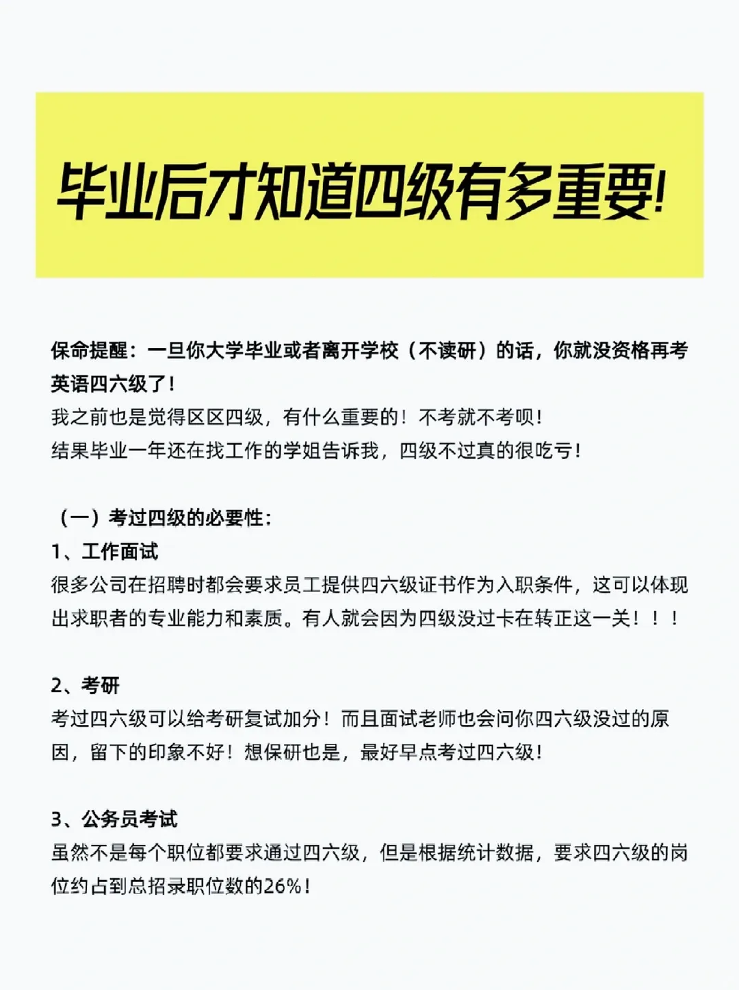 银行从业、教资、部分医护、会计类岗位招聘,都偏好英语合格者。大学生英语四六级为什么要尽早考?越拖越难!
