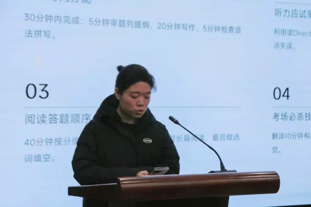 胡旭然为分享会致开场辞,她深入阐释了英语四六级考试在学生学业发展与未来就业规划中的重要价值,勉励在场同学珍惜此次学习交流机会,积极借鉴优秀备考经验,坚定备考信心,以饱满昂扬的状态备战四六级考试。