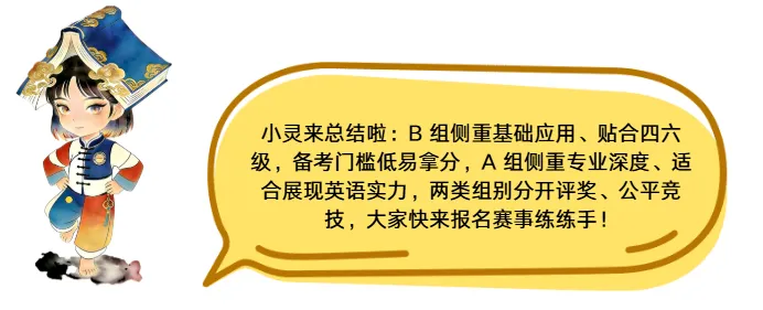相较于B组,A组更考察文化内涵的精准传递,需积累中国传统文化、中外文明互鉴的专业英文表述,理解词汇背后的文化逻辑,避免直译误区,贴合赛事“用英语讲好中国故事”的核心。