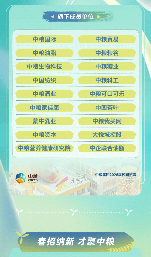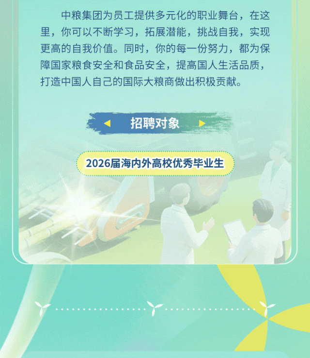 ✅ 岗位覆盖:2000+优质岗位,涵盖研发技术、业务运营、管培生、职能管理、生产技能五大类,文理工科全适配,工作地点覆盖全国40+城市及全球主要粮农产区。