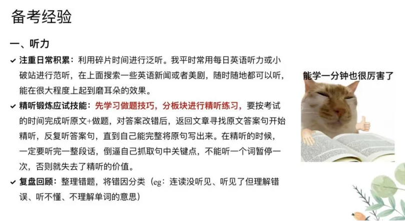 针对大部分同学最头疼的听力,她不仅带来了精选的优质网课与备考资源,更传授了在有限时间内精准刷题、高效提分的实用方法。她强调,备考不必盲目堆砌时间,而是要在理解考试逻辑的基础上,做到有的放矢。