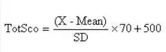 TotSco表示四六级总分;X表示每位考生常模转换前的原始总分;Mean表示常模均值,是根据不同标准的抽样数据来计算。