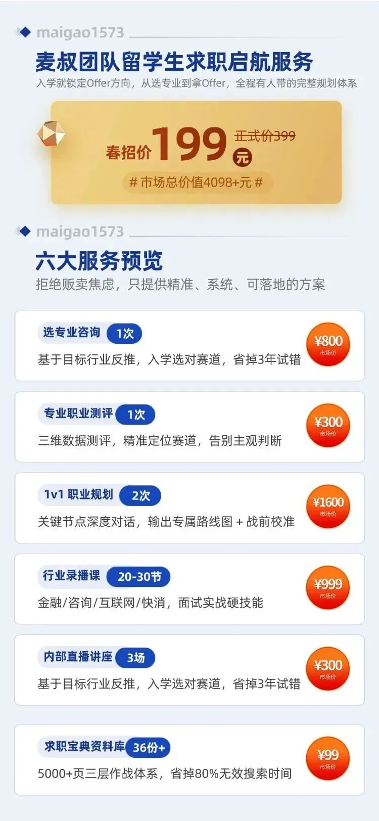 服务完整说明点链接查看:别等毕业才慌!聪明的留学生,入学就锁定了Offer方向 | 麦叔职规启航服务