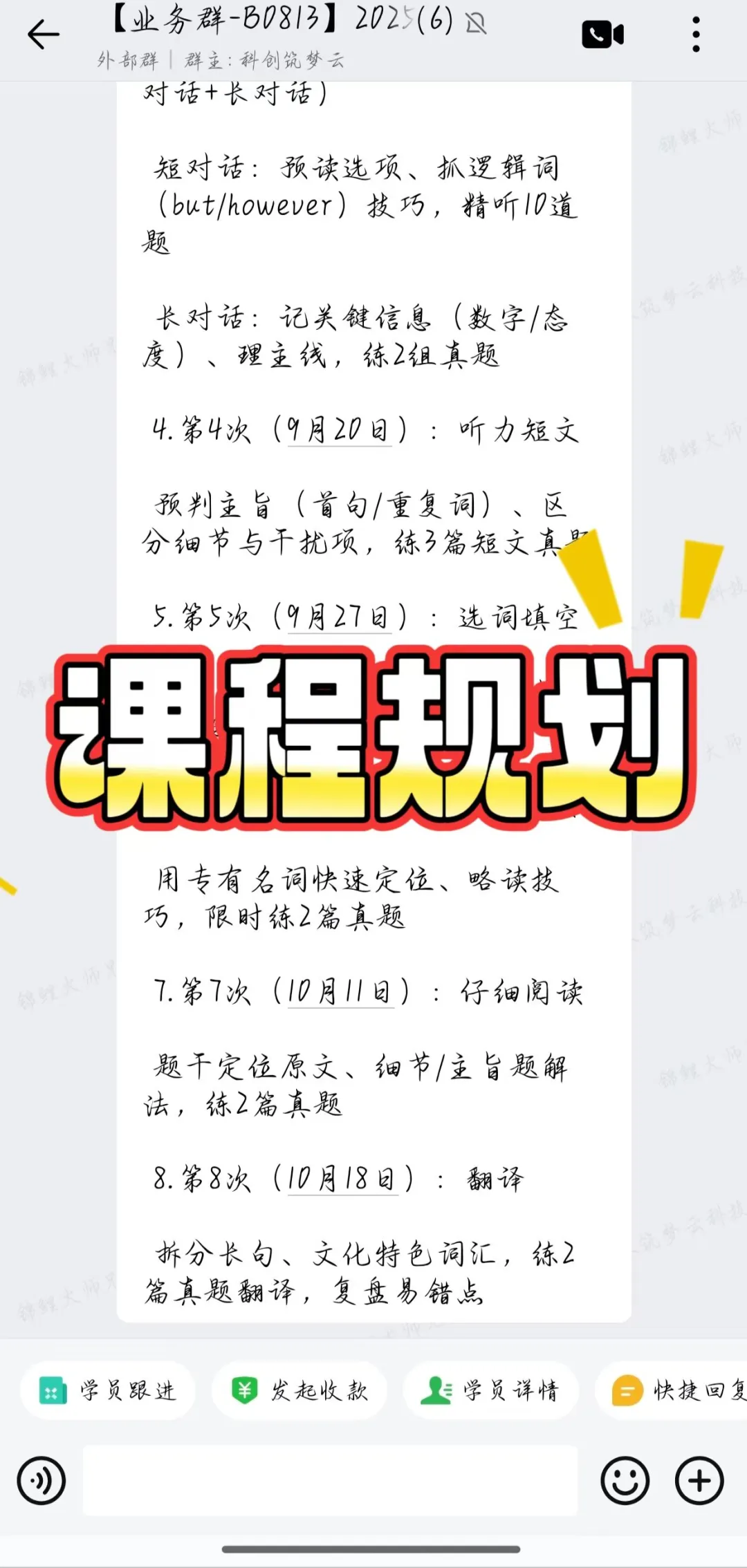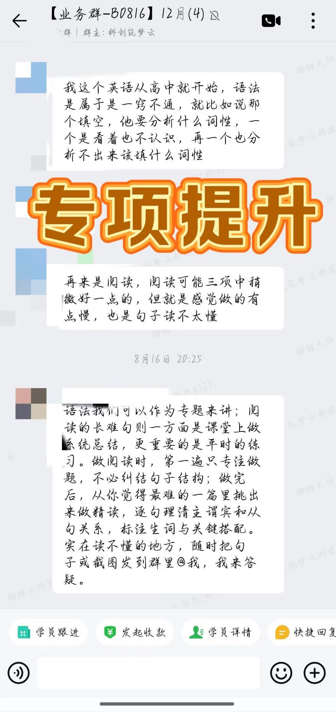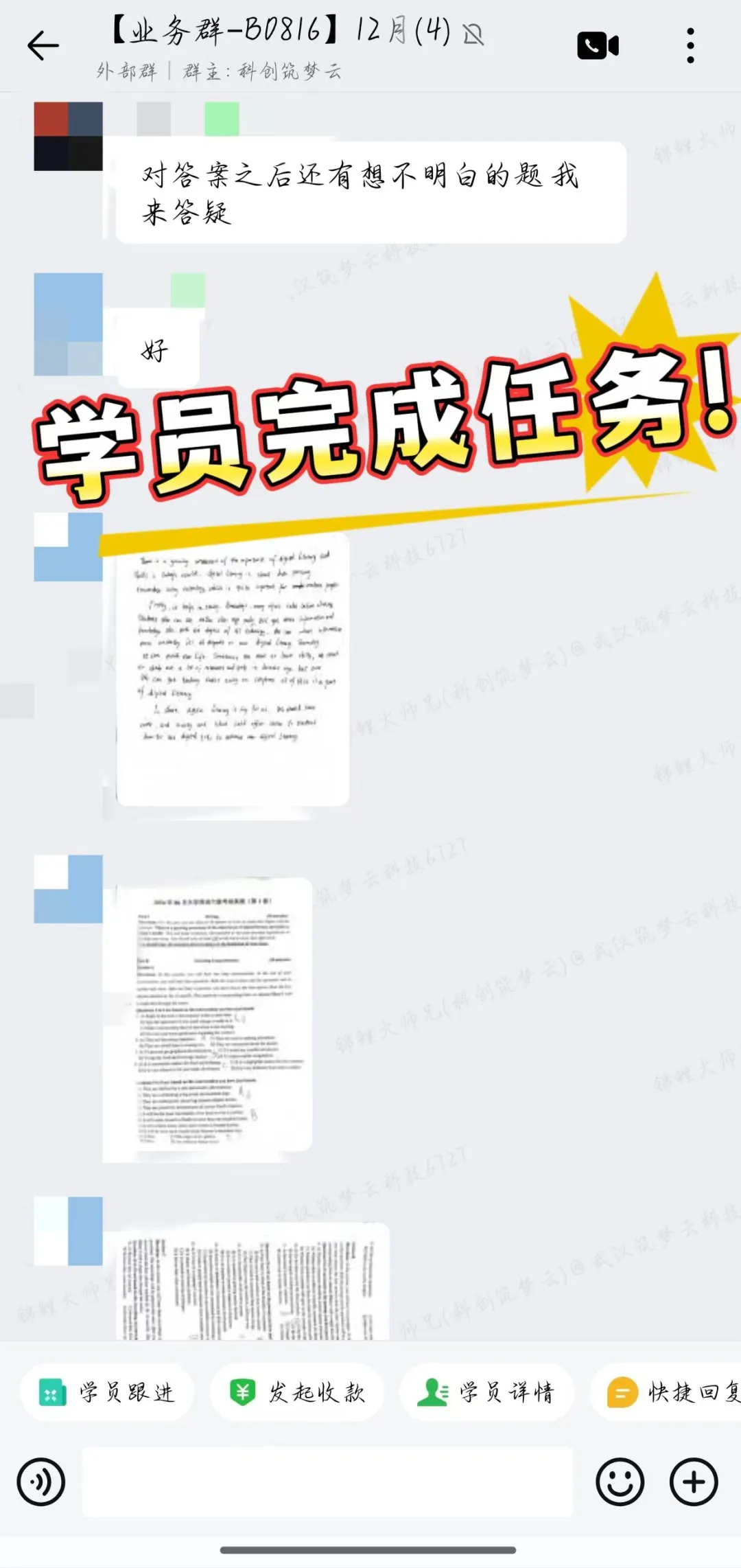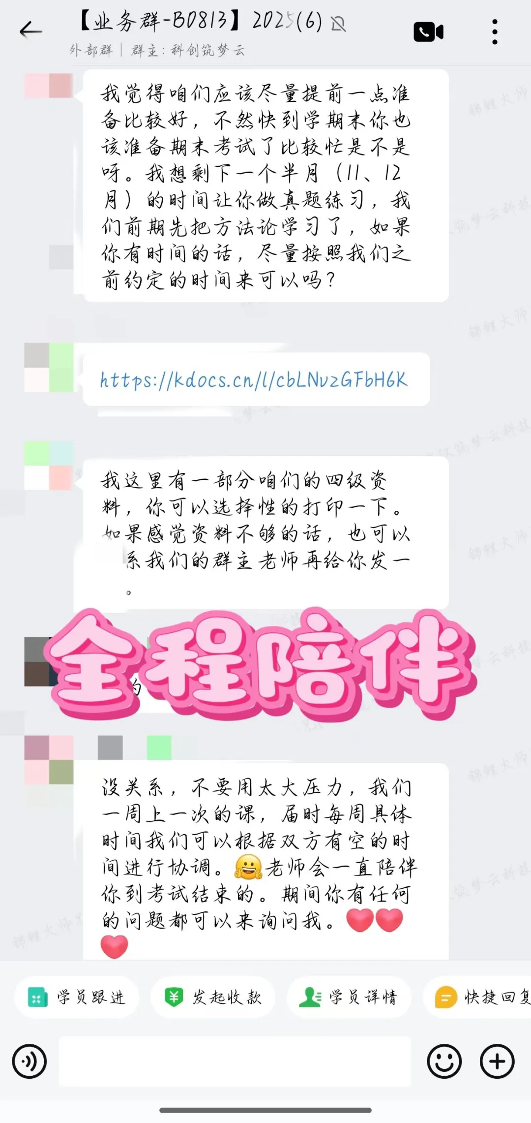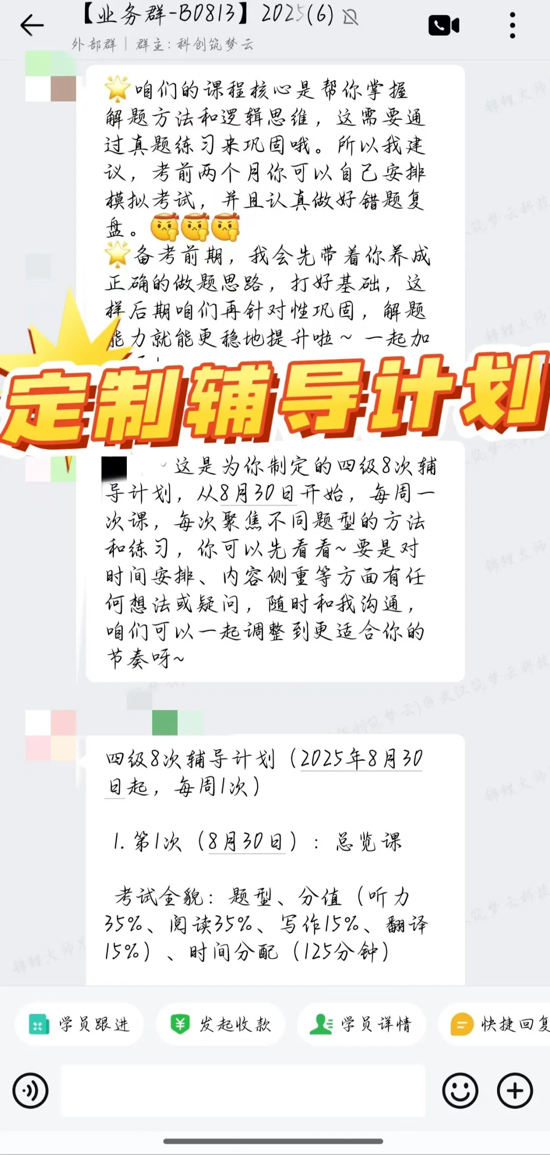 关于专项辅导的具体详情信息,请添加辅导顾问微信咨询。有任何问题,辅导顾问都会随时解答,为你提供详细说明。确定报名并完成付款后,小助理会邀请你加入企业微信专属业务群,确保你的课程安排、学习进度都能顺利推进。