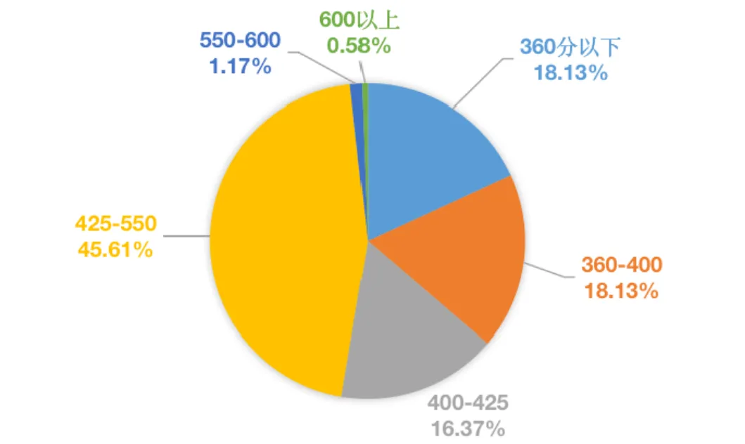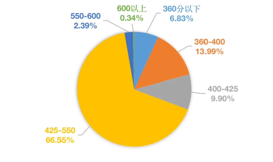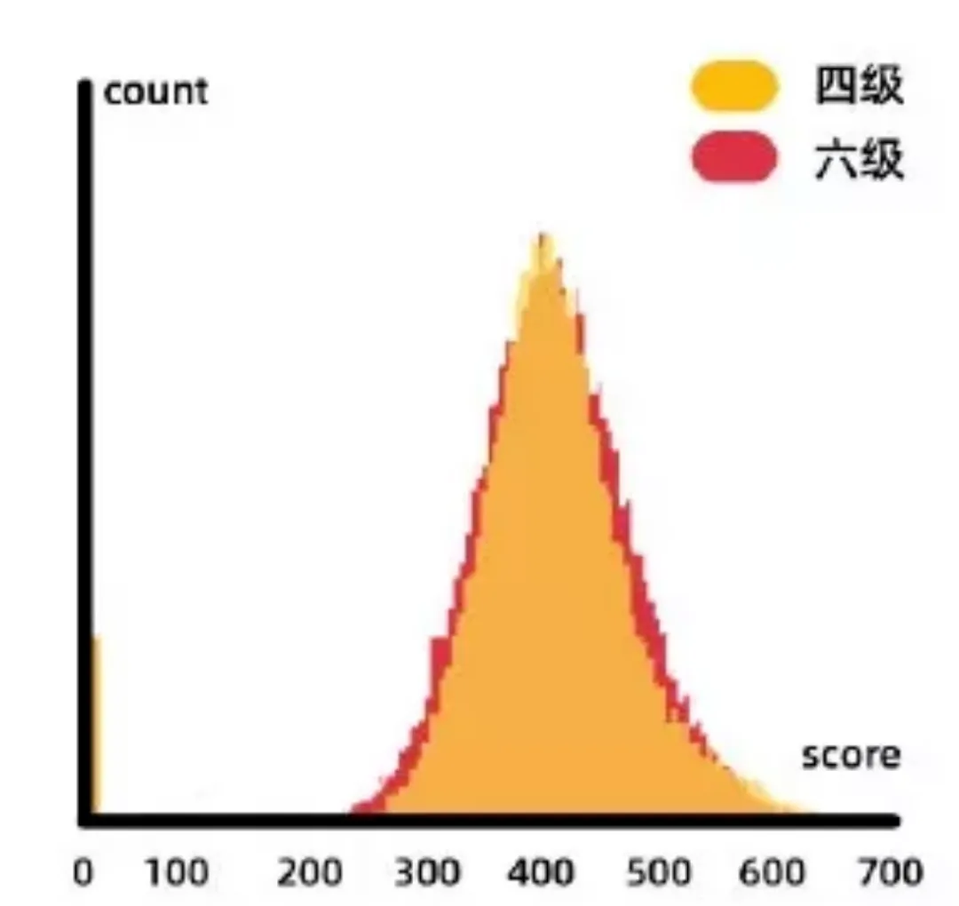 从图表来看,425–550这一区间的人数相对比较多,无论四级还是六级,分数高于550或低于400的考生占比相对较小。
