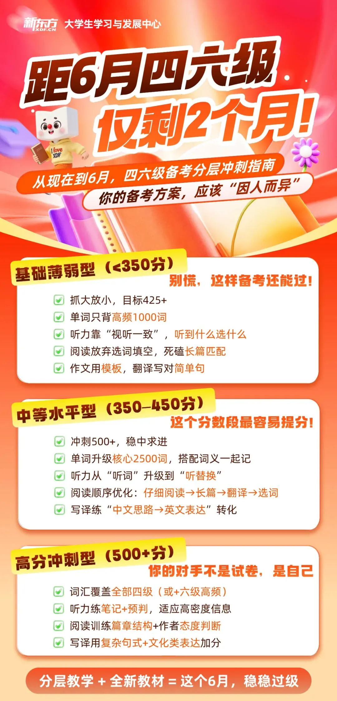 目前距离考试还有两个多月,可以考虑从词汇、听力训练和阅读练习等方面分阶段推进。如果你正在寻找更系统的学习路径,也可以咨询新东方四六级