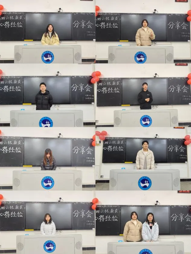 四六级备考分享中,同学们聚焦应试技巧与日常积累。魏子言建议六级备考聚焦听力,通过听英文歌曲、看美剧培养语感,勉励大家坚持到底。刘芊同学重申做题顺序与单词基础的重要性,结合真题总结各题型的答题技巧;黄婷同学强调听力多听多练、阅读灵活应变,坚持每日练习保持手感;陈樱之同学主张以真题为核心,及时整理生词难句并翻译,做题时严格计时把控时间;邹杨涛同学为基础薄弱的同学推荐名师课程,强调坚持的重要性;高露珊同学强调,备考时可通过整套真题练习查漏补缺、针对性提升,提供了具体可操作的思路。