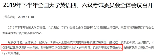 在19年10月23日召开的全国大学英语四、六级考试委员会全体会议上,全体委员一致建议尽早将CET口语考试纳入必考科目。