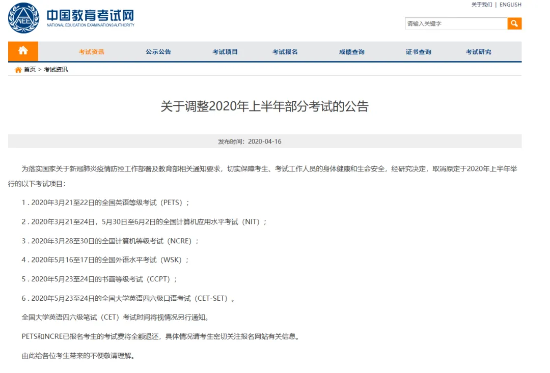 PETS和NCRE已报名考生的考试费将全额退还,具体情况请考生密切关注报名网站有关信息。