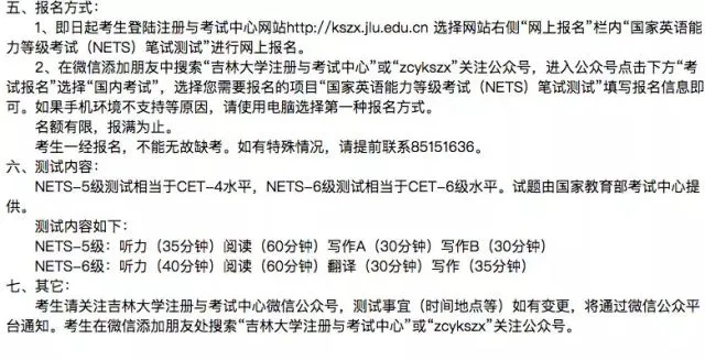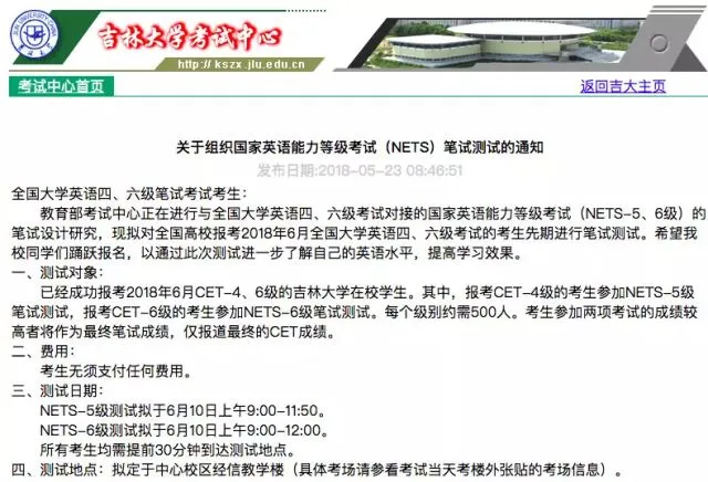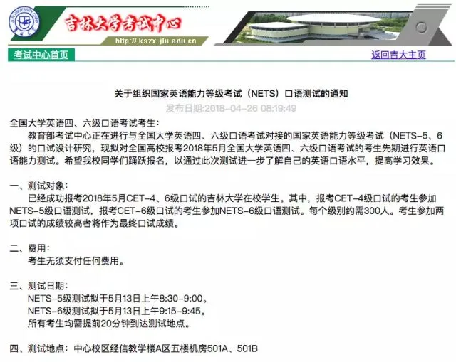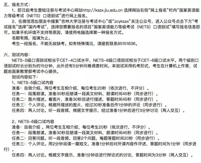 已经成功报考2018年5月CET-4、6级口试的吉林大学在校学生。其中,报考CET-4级口试的考生参加NETS-5级口语测试,报考CET-6级口试的考生参加NETS-6级口语测试。每个级别约需300人。考生参加两项口试的成绩较高者将作为最终口试成绩。