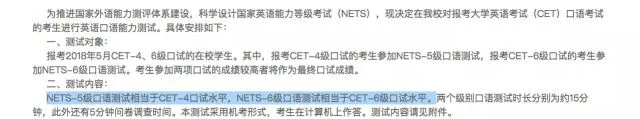 教育部考试中心正在进行与全国大学英语四、六级口语考试对接的国家英语能力等级考试(NETS-5、6级)的口试设计研究,现拟对全国高校报考2018年5月全国大学英语四、六级口语考试的考生先期进行英语口语能力测试。希望我校同学们踊跃报名,以通过此次测试进一步了解自己的英语口语水平,提高学习效果。