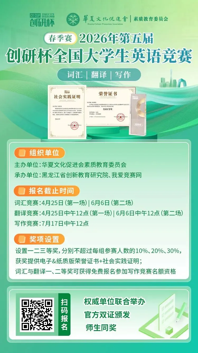 2、词汇竞赛的一、二等奖获得者可免费报名参加同赛季的写作竞赛。