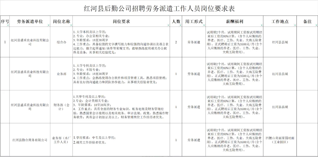 详见附件2《红河县后勤服务管理有限公司招聘工作人员岗位要求表》中具体要求。