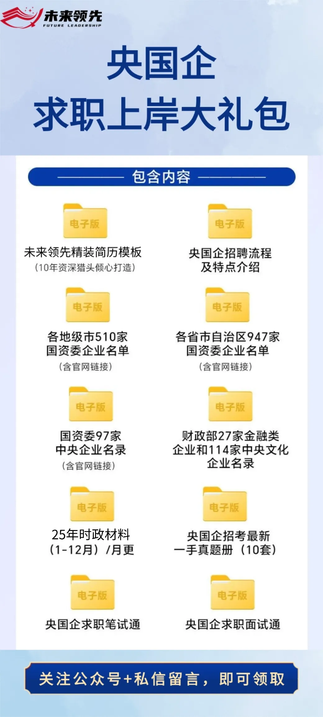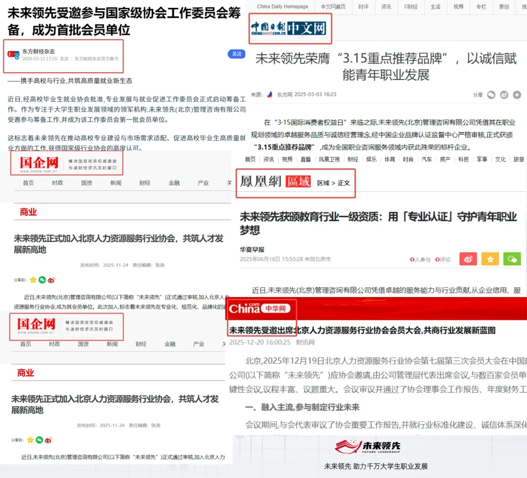 要知道,央国企春招竞争有多激烈——热门岗位报录比动辄100:1,网申通过率不足30%,笔试考点繁杂、面试评分标准不透明,仅凭孩子自己摸索,很难脱颖而出,甚至会错过关键岗位的投递时间。3、优先投递截止时间近、专业匹配度高的岗位,不做无效内耗;4、投递后立刻准备笔试,行测 + 专业知识同步抓,不裸考、不拖延;5、简历突出适配性,重点写与央国企岗位相关的技能、经历,不堆砌无关内容;6、面试提前练,熟记高频真题和应答话术,克服紧张感;7、每天花 30 分钟关注央国企招聘动态,避免错过岗位补录、截止通知;8、应届生身份别浪费,优先投只招应届生的岗位,避开社招竞争。如果看完这些方法你还是云里雾里不知道如何着手,还是没有太大的把握,心理没底,那么,不要再浪费自己的时间和精力了,把专业的事交给专业的人来做!就相当于给孩子找了一个“业内引路人”,帮孩子轻松备考,高效上岸,这也是聪明家长的“借力”之道!而学会“借力”,才是真正的“省时省力”,才能真正做到“事半功倍”!作为深耕央国企校招领域十年、行业领先的专业辅导机构,我们凭借权威资质、独家资源和全流程闭环服务,成为万千家长和应届生的首选,全方位优势直击家长顾虑,真正做到让家长省心、孩子高效上岸:1. 十年耕耘,权威资质背书,靠谱有保障:- 2016年10月,京诚智教(北京)科技有限公司(未来领先母公司)于北京海淀成立,首发“职业基因检测”1.0产品,结合MBTI与霍兰德测评的本地化应用,为中国大学生职业规划科学起步提供支持。