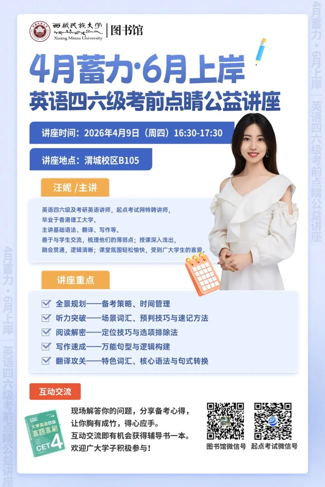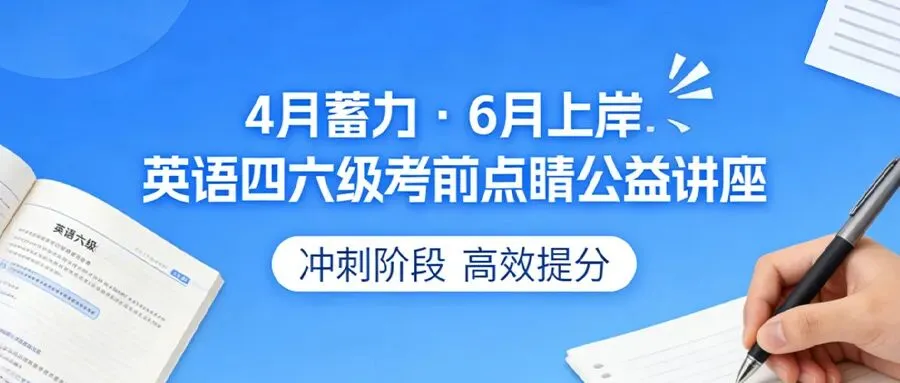 别慌!图书馆专为同学们量身打造的英语四六级考前点睛公益讲座!拒绝无效内卷,解锁应试秘籍,让你在4月高效蓄力,6月稳稳上岸!