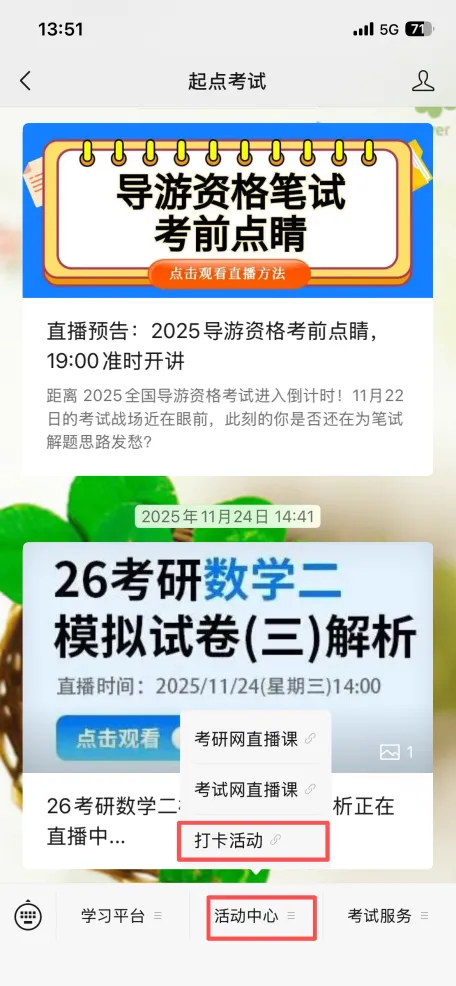 微信端:微信关注「起点考试」公众号→活动中心→打卡活动,完成注册后每日答题打卡;