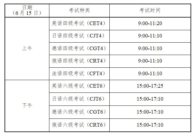 开考科目为英语、日语、德语和俄语4个语种的四级和六级,