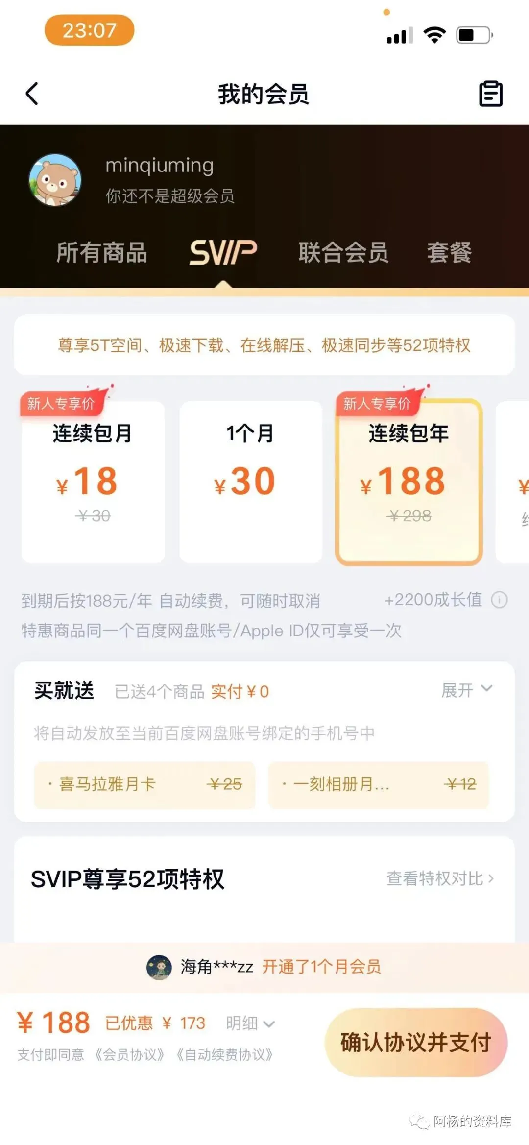 但是阿杨学姐给大家找到了官方隐藏的优惠渠道,新用户直接188就可以了,老用户续费是197,如下图