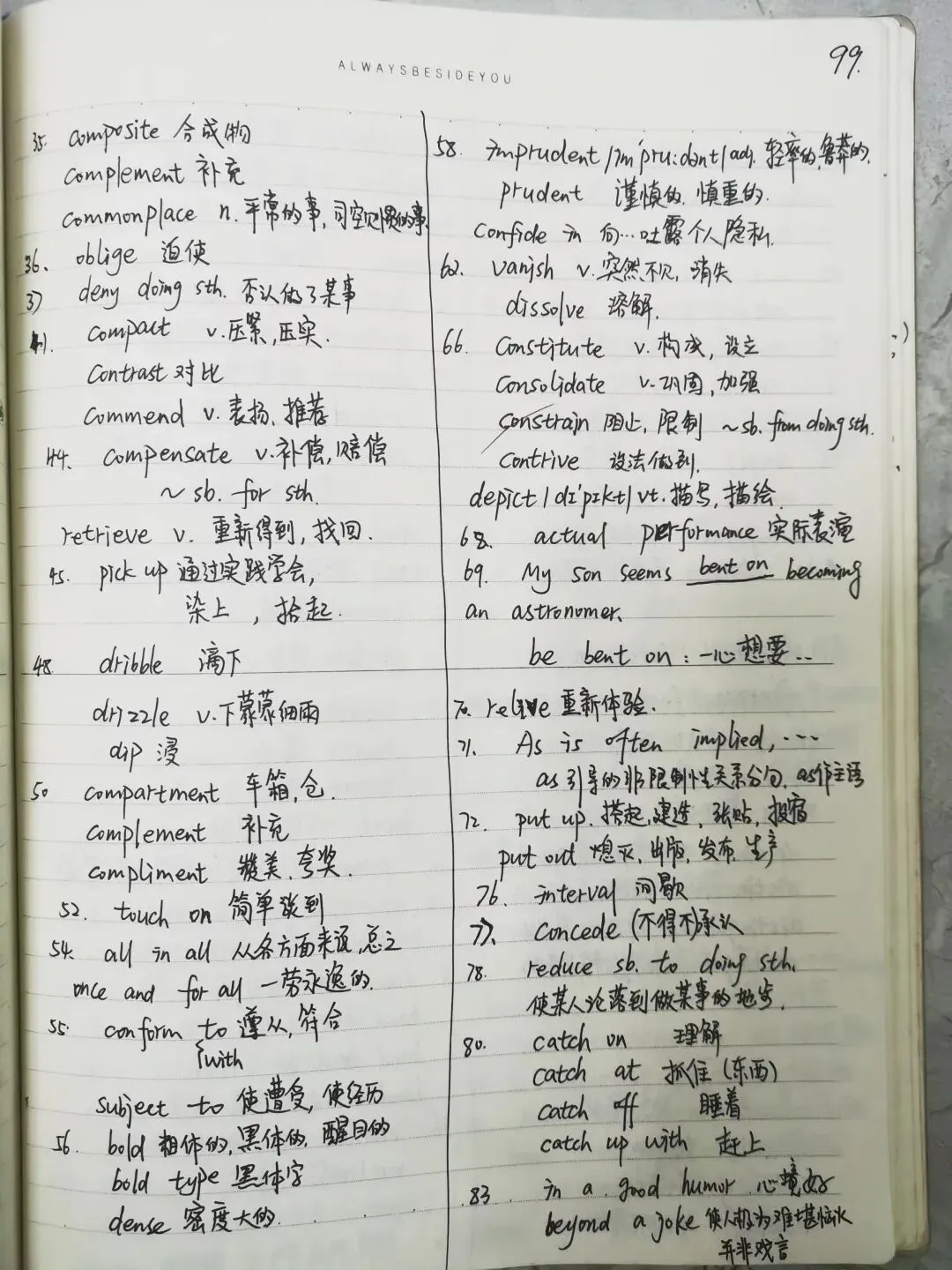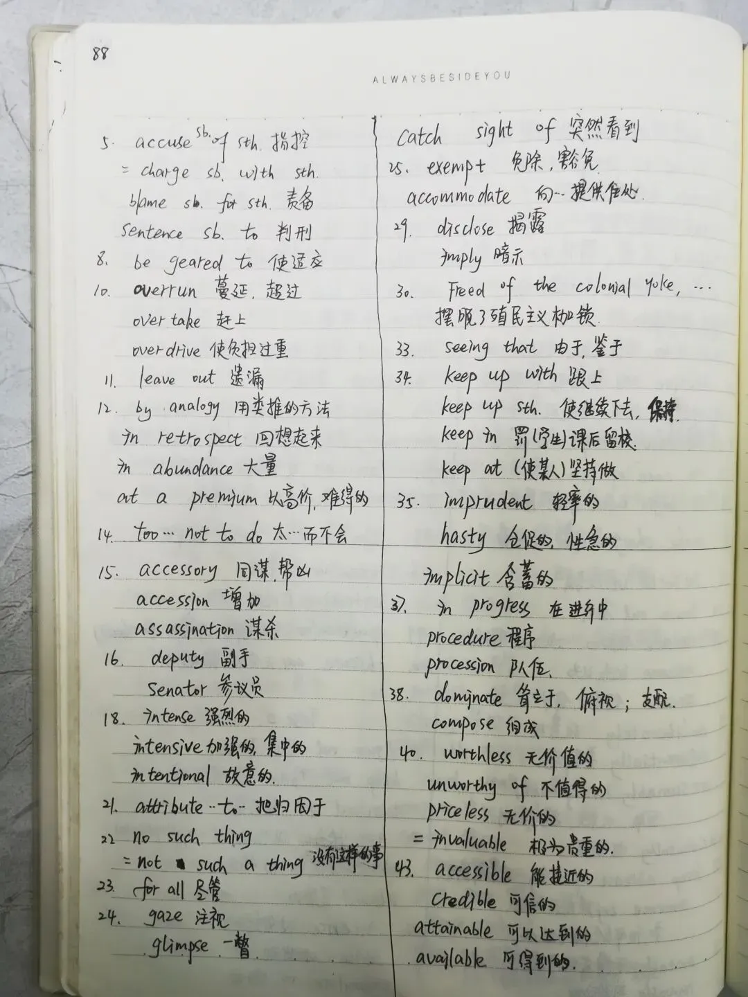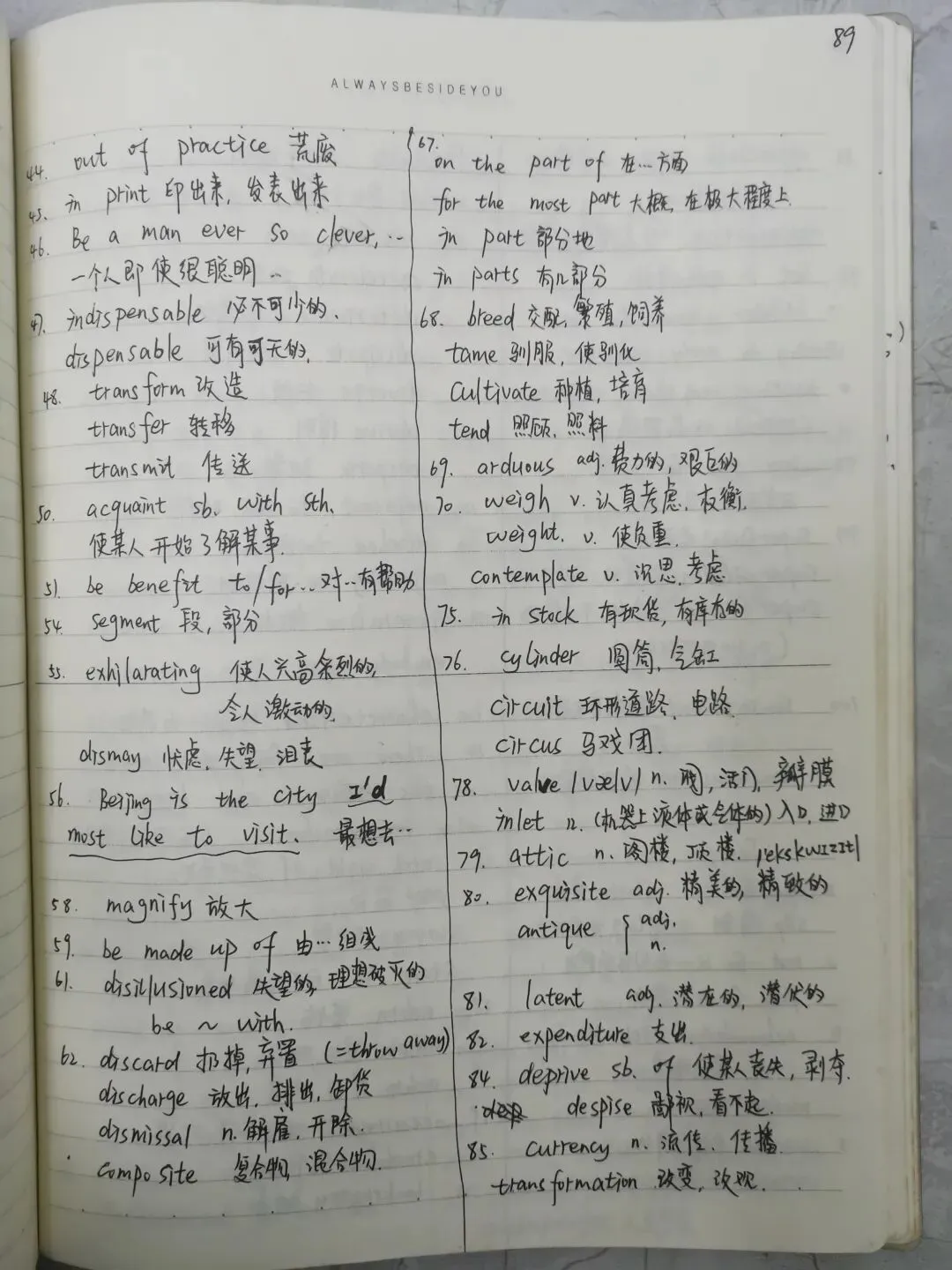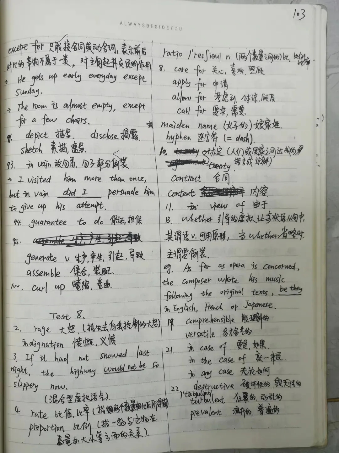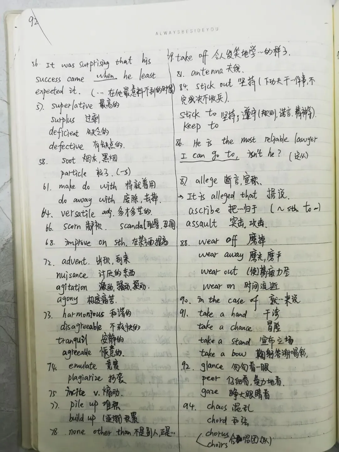 回想自己当年读大学的经历,记笔记是我一直坚持的习惯——这个习惯是我从小学四五年级就开始养成的。初高中时候,我只记录语文和英语笔记,数理化从来没有正式的笔记本,只在课本空白处简单记录一些知识点和解题思路。到了大学,来到英语专业,学习的专业课程都与英语密切相关——综合英语、高级英语、英语泛读、英语听力、英语笔译、英语口译。当然,我们专业的学生还要学习《高等数学》上册和几门外贸相关课程。遗憾的是,外国语学院居然不开设任何汉语课程,而教学楼里却赫然张贴着“学好外国语,做好中国人”的标语,这真是太搞笑了。从小学开始,我就习惯了阅读背诵历朝历代的诗词歌赋、散文、小说、议论文、说明文等各种体裁的文学作品。到了大学,《语文》这门学了十几年的课程突然不学了,实在有些难以接受。郁闷之余,我只好自己前往图书馆,借阅一些中国近现代文学作品,聊以打发周末闲暇时光。本期文章整理了笔者大学英语专业本科阶段备考专四专八的刷题笔记(拍照,笔记本第85页至第116页,共32页),涉及语法知识点、词汇辨析、短语用法等,可供备考大学英语四六级、专四专八、考研英语的学生和其他英语学习者学习使用。