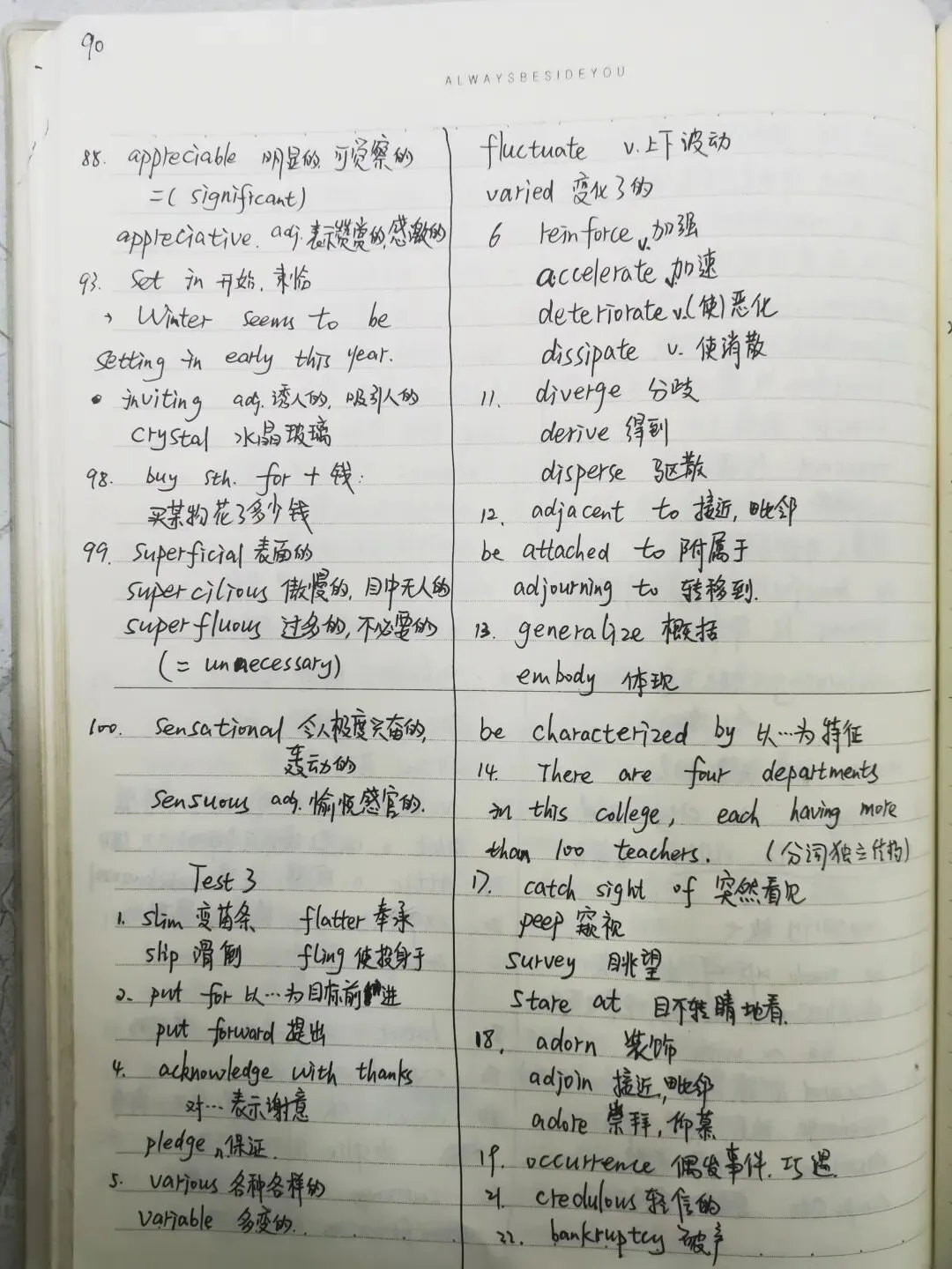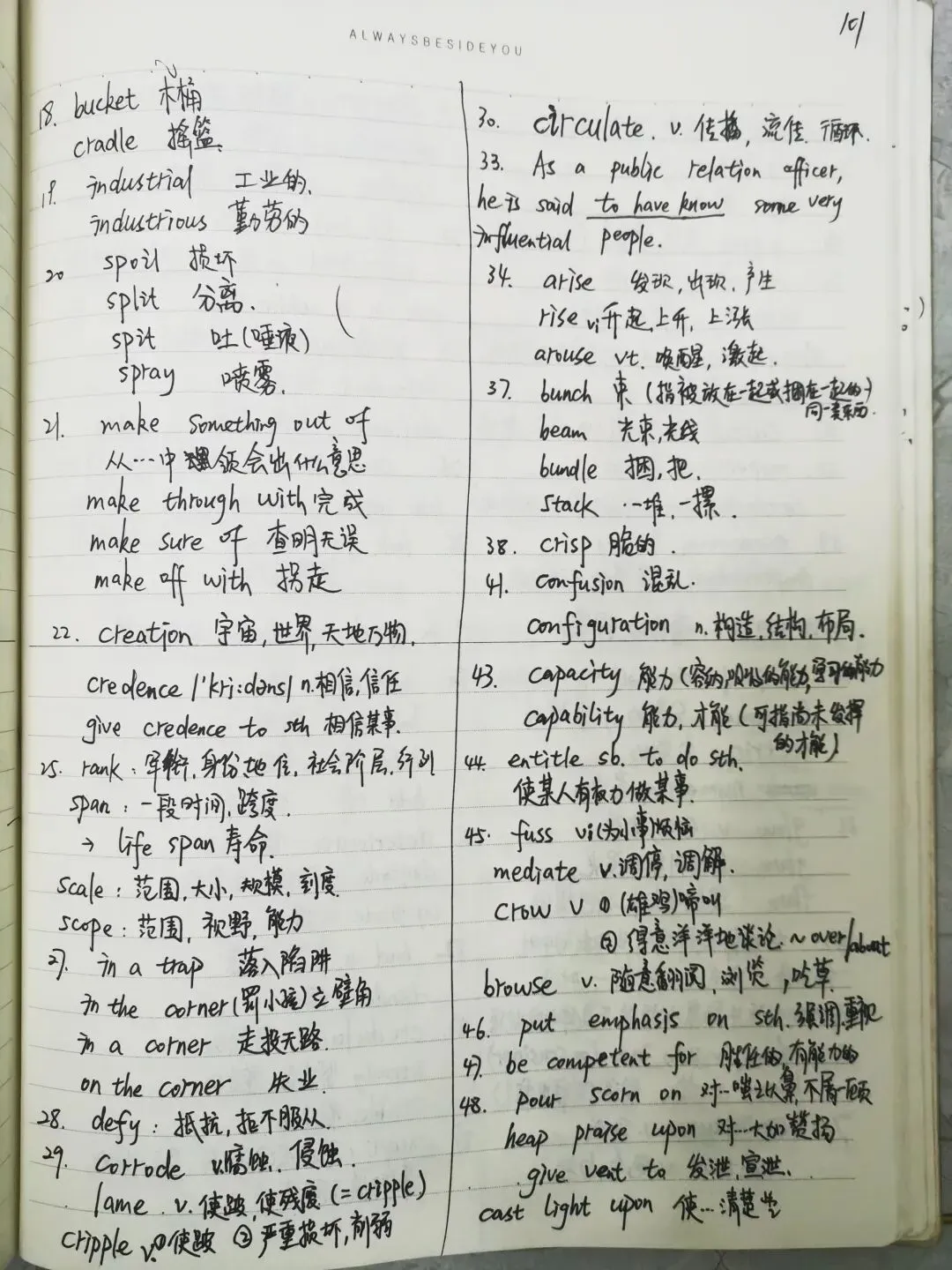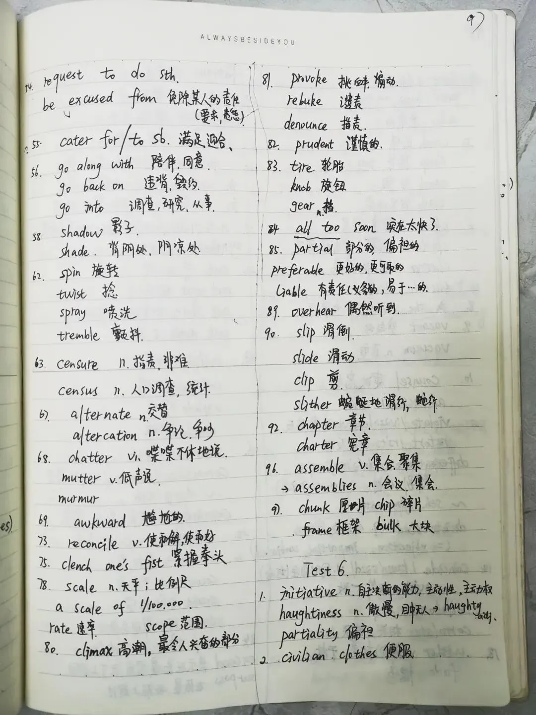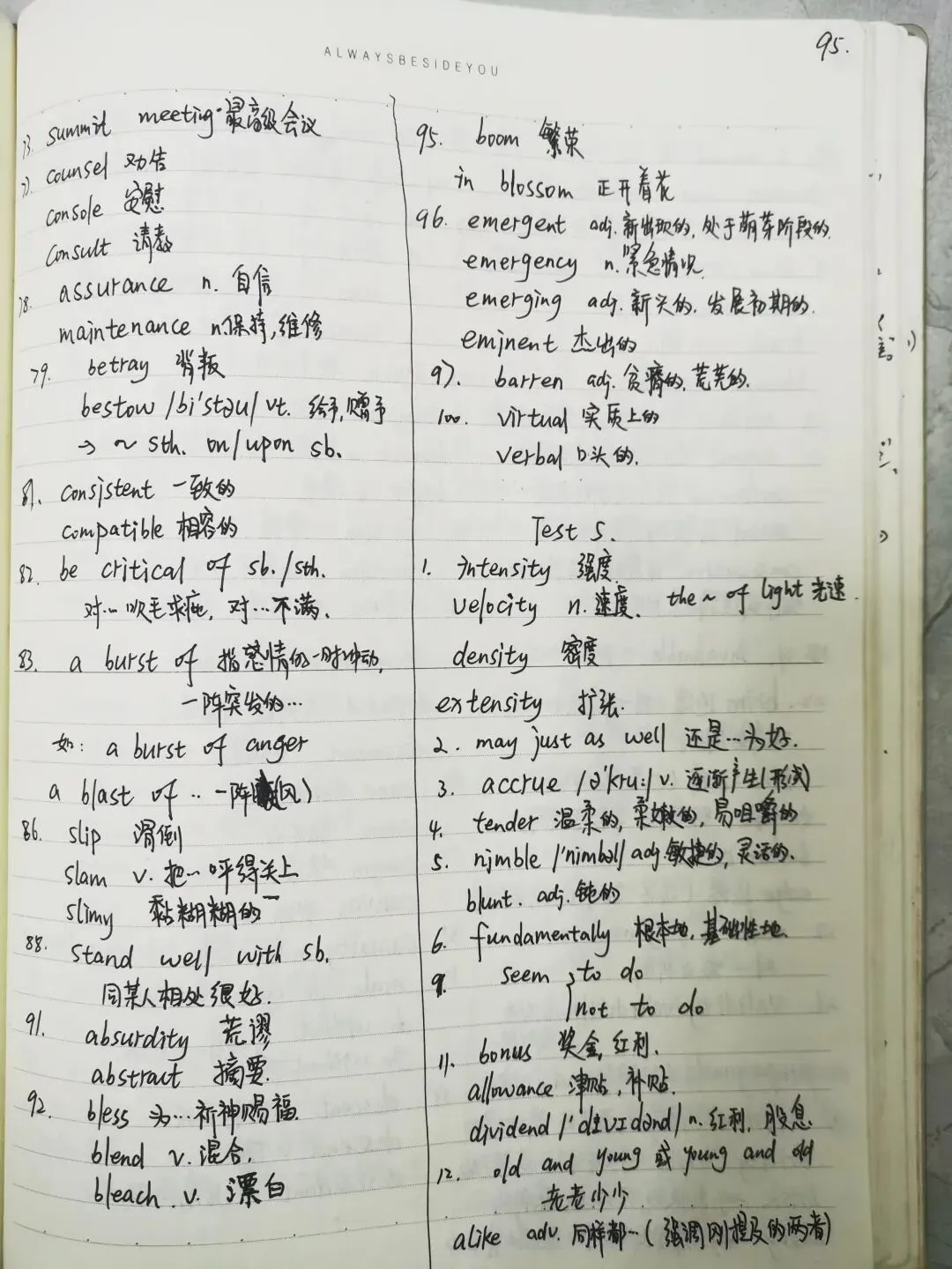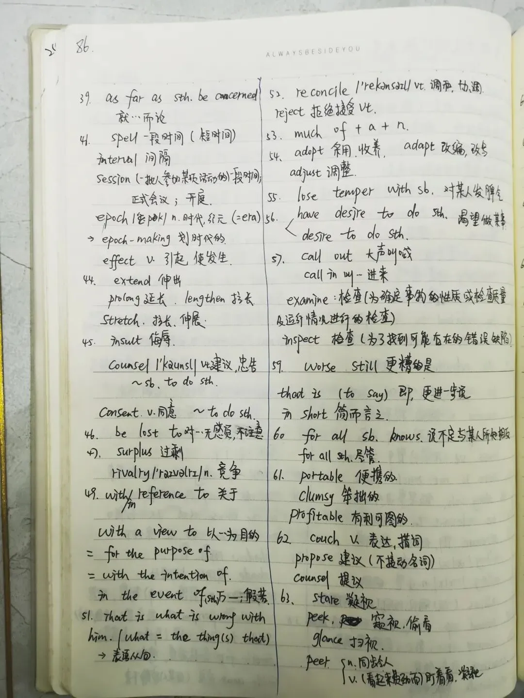 回想自己当年读大学的经历,记笔记是我一直坚持的习惯——这个习惯是我从小学四五年级就开始养成的。初高中时候,我只记录语文和英语笔记,数理化从来没有正式的笔记本,只在课本空白处简单记录一些知识点和解题思路。到了大学,来到英语专业,学习的专业课程都与英语密切相关——综合英语、高级英语、英语泛读、英语听力、英语笔译、英语口译。当然,我们专业的学生还要学习《高等数学》上册和几门外贸相关课程。遗憾的是,外国语学院居然不开设任何汉语课程,而教学楼里却赫然张贴着“学好外国语,做好中国人”的标语,这真是太搞笑了。从小学开始,我就习惯了阅读背诵历朝历代的诗词歌赋、散文、小说、议论文、说明文等各种体裁的文学作品。到了大学,《语文》这门学了十几年的课程突然不学了,实在有些难以接受。郁闷之余,我只好自己前往图书馆,借阅一些中国近现代文学作品,聊以打发周末闲暇时光。本期文章整理了笔者大学英语专业本科阶段备考专四专八的刷题笔记(拍照,笔记本第85页至第116页,共32页),涉及语法知识点、词汇辨析、短语用法等,可供备考大学英语四六级、专四专八、考研英语的学生和其他英语学习者学习使用。