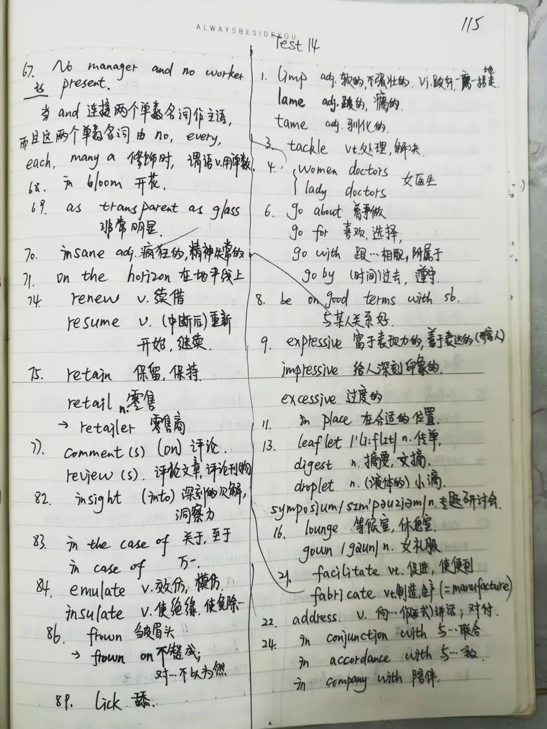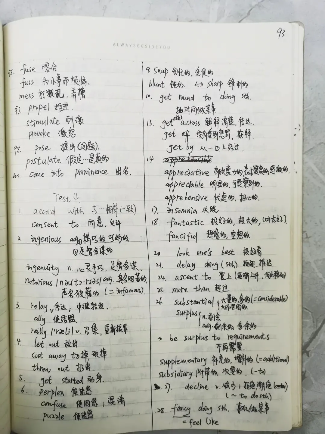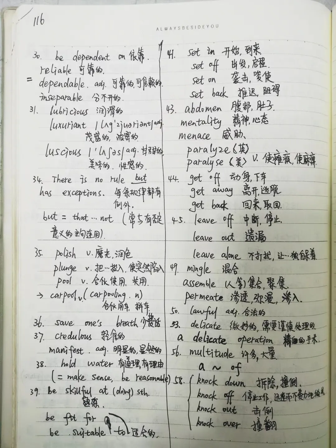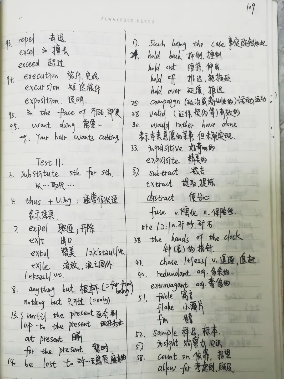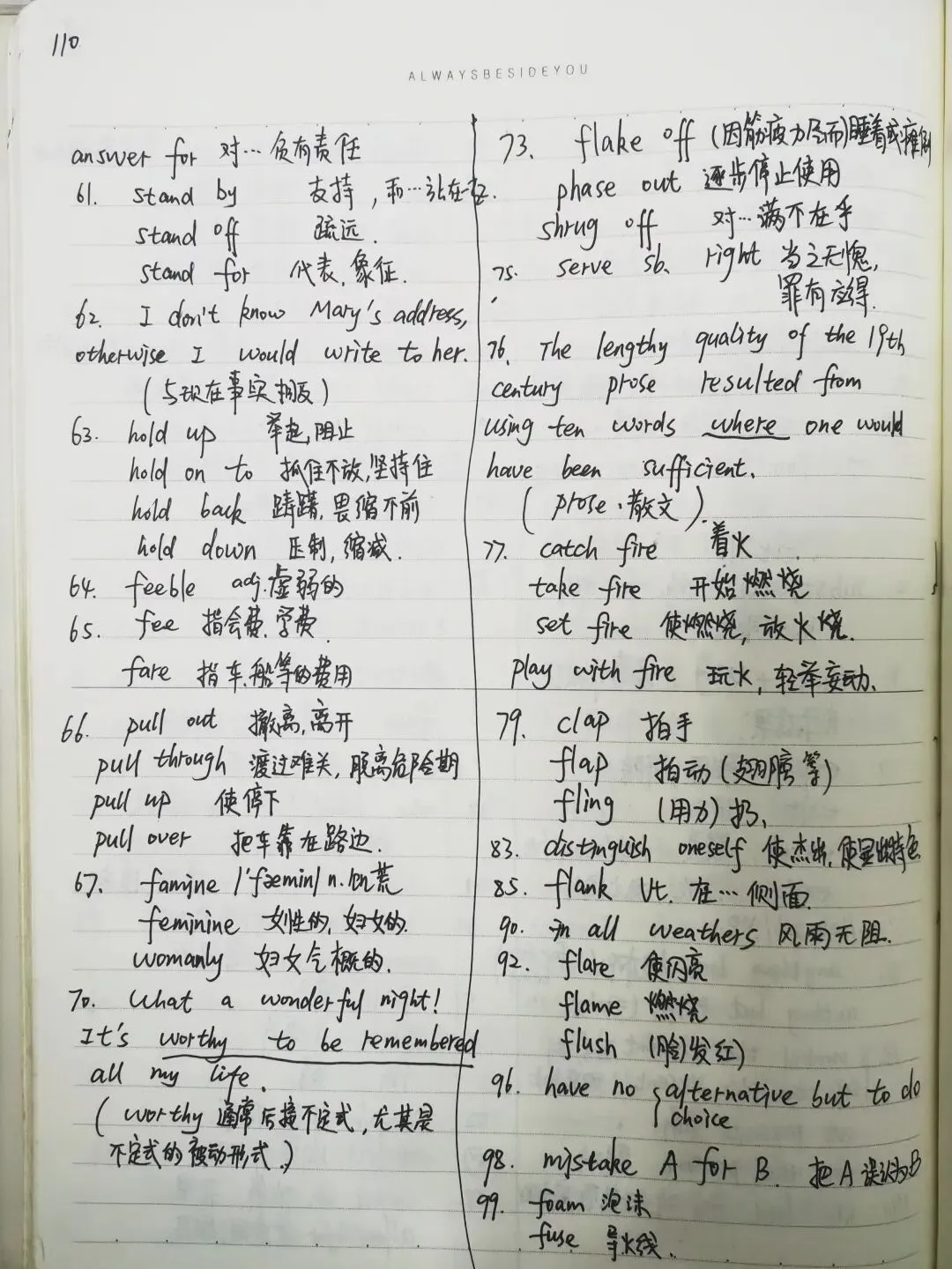 回想自己当年读大学的经历,记笔记是我一直坚持的习惯——这个习惯是我从小学四五年级就开始养成的。初高中时候,我只记录语文和英语笔记,数理化从来没有正式的笔记本,只在课本空白处简单记录一些知识点和解题思路。到了大学,来到英语专业,学习的专业课程都与英语密切相关——综合英语、高级英语、英语泛读、英语听力、英语笔译、英语口译。当然,我们专业的学生还要学习《高等数学》上册和几门外贸相关课程。遗憾的是,外国语学院居然不开设任何汉语课程,而教学楼里却赫然张贴着“学好外国语,做好中国人”的标语,这真是太搞笑了。从小学开始,我就习惯了阅读背诵历朝历代的诗词歌赋、散文、小说、议论文、说明文等各种体裁的文学作品。到了大学,《语文》这门学了十几年的课程突然不学了,实在有些难以接受。郁闷之余,我只好自己前往图书馆,借阅一些中国近现代文学作品,聊以打发周末闲暇时光。本期文章整理了笔者大学英语专业本科阶段备考专四专八的刷题笔记(拍照,笔记本第85页至第116页,共32页),涉及语法知识点、词汇辨析、短语用法等,可供备考大学英语四六级、专四专八、考研英语的学生和其他英语学习者学习使用。