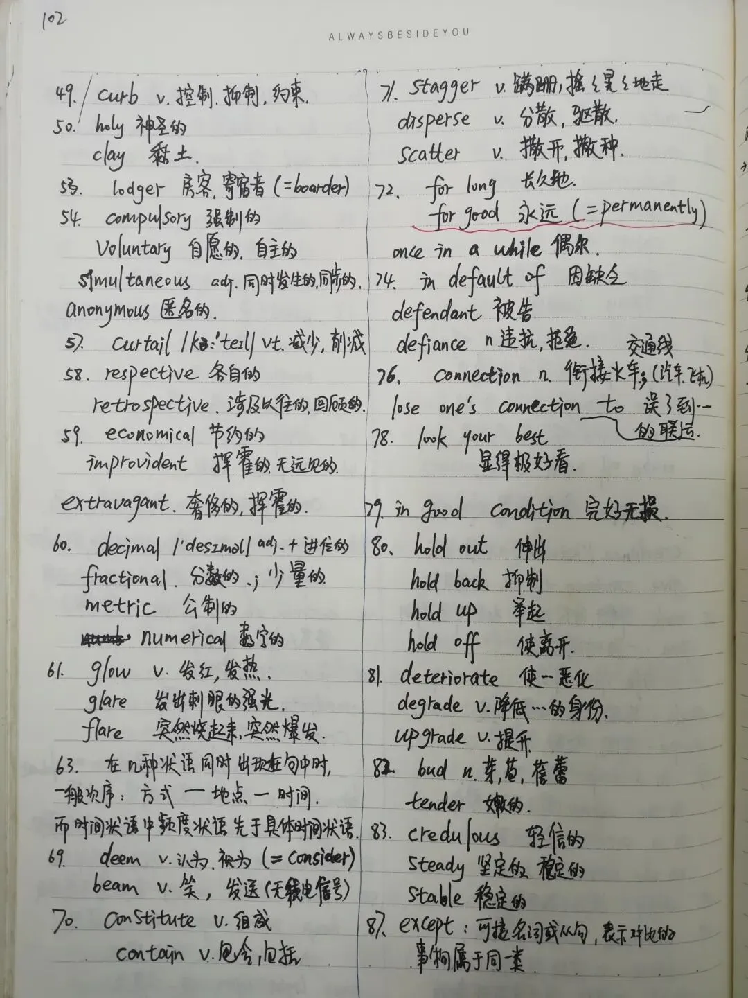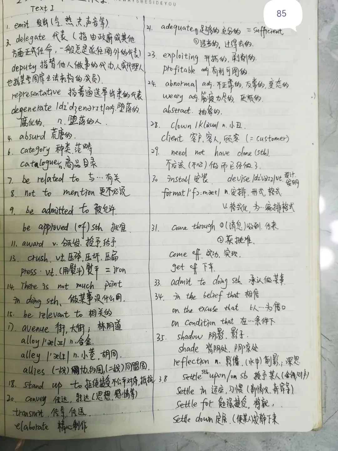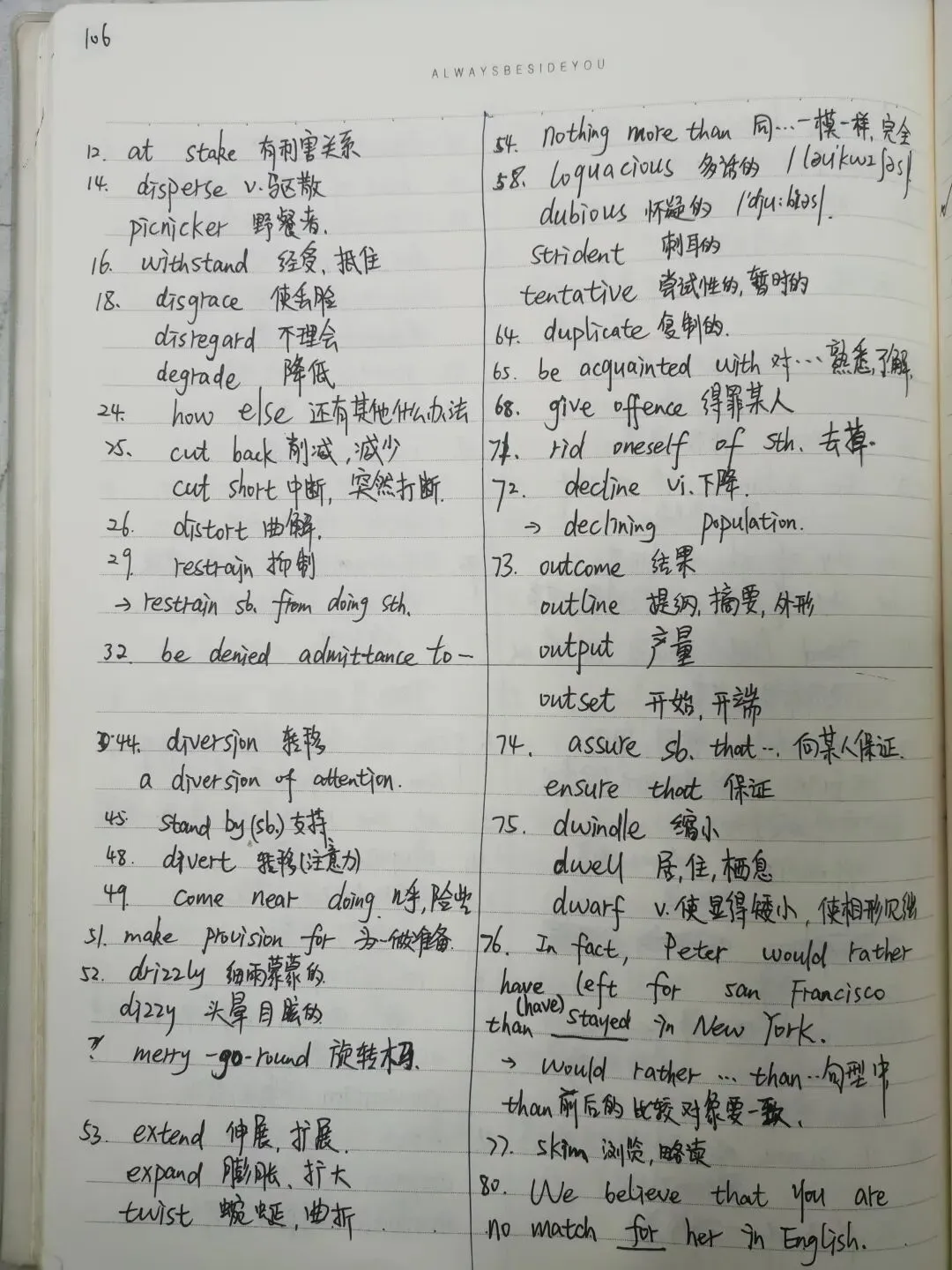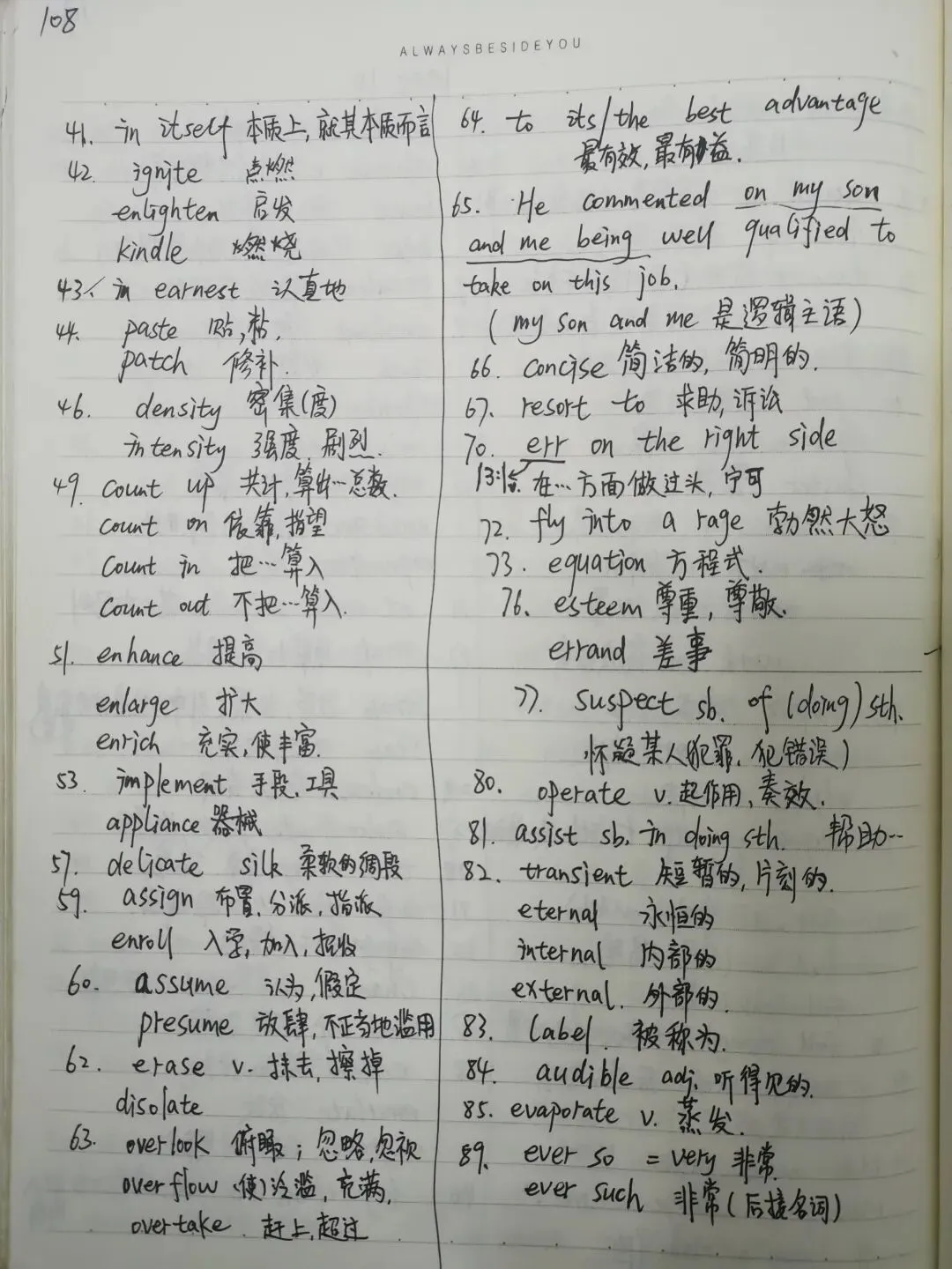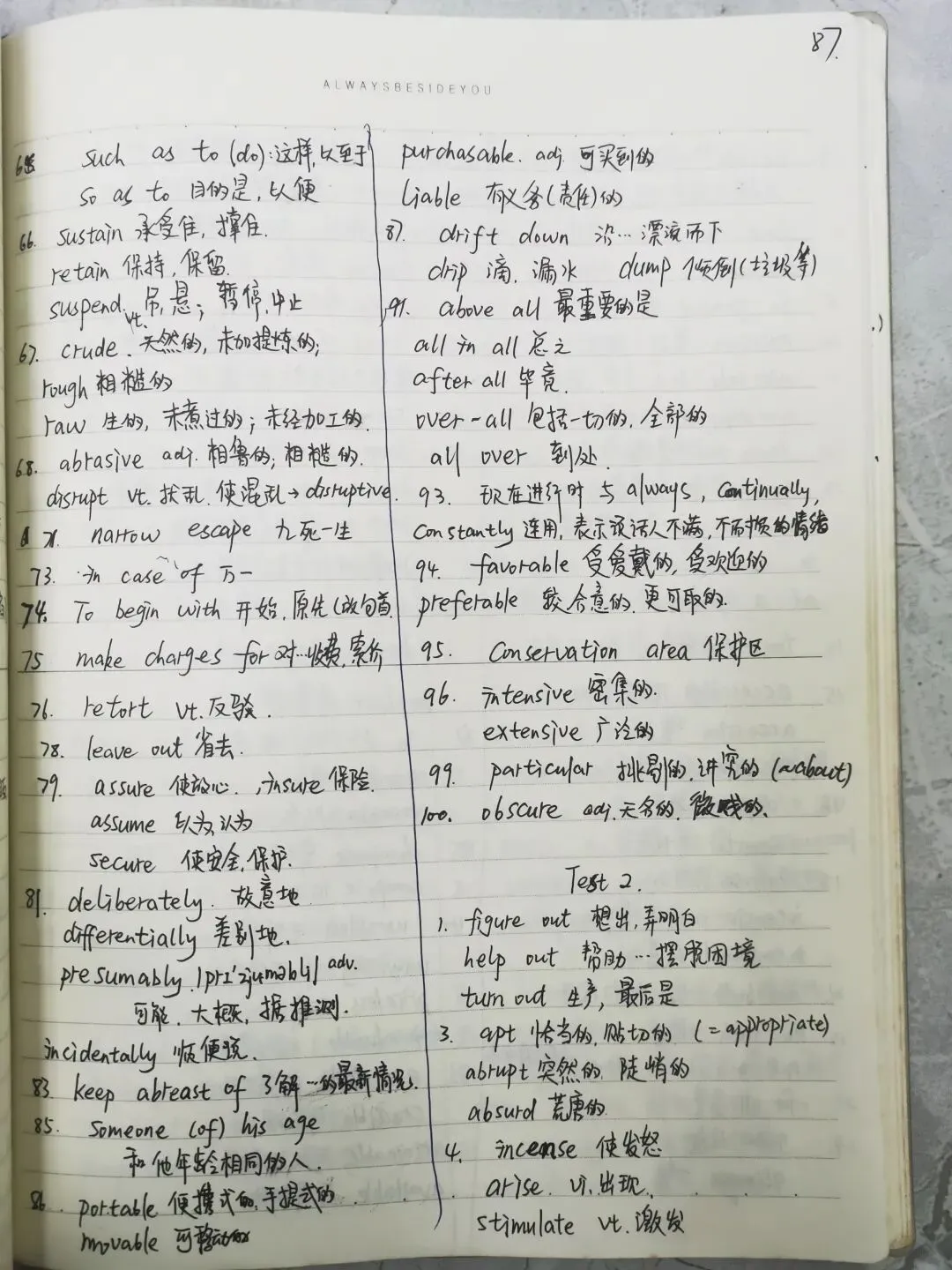 回想自己当年读大学的经历,记笔记是我一直坚持的习惯——这个习惯是我从小学四五年级就开始养成的。初高中时候,我只记录语文和英语笔记,数理化从来没有正式的笔记本,只在课本空白处简单记录一些知识点和解题思路。到了大学,来到英语专业,学习的专业课程都与英语密切相关——综合英语、高级英语、英语泛读、英语听力、英语笔译、英语口译。当然,我们专业的学生还要学习《高等数学》上册和几门外贸相关课程。遗憾的是,外国语学院居然不开设任何汉语课程,而教学楼里却赫然张贴着“学好外国语,做好中国人”的标语,这真是太搞笑了。从小学开始,我就习惯了阅读背诵历朝历代的诗词歌赋、散文、小说、议论文、说明文等各种体裁的文学作品。到了大学,《语文》这门学了十几年的课程突然不学了,实在有些难以接受。郁闷之余,我只好自己前往图书馆,借阅一些中国近现代文学作品,聊以打发周末闲暇时光。本期文章整理了笔者大学英语专业本科阶段备考专四专八的刷题笔记(拍照,笔记本第85页至第116页,共32页),涉及语法知识点、词汇辨析、短语用法等,可供备考大学英语四六级、专四专八、考研英语的学生和其他英语学习者学习使用。