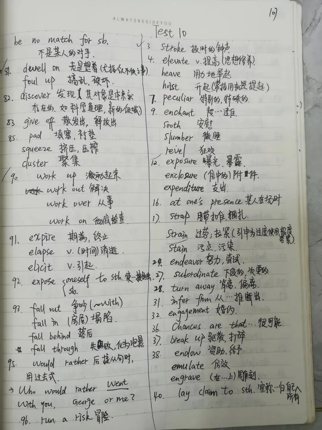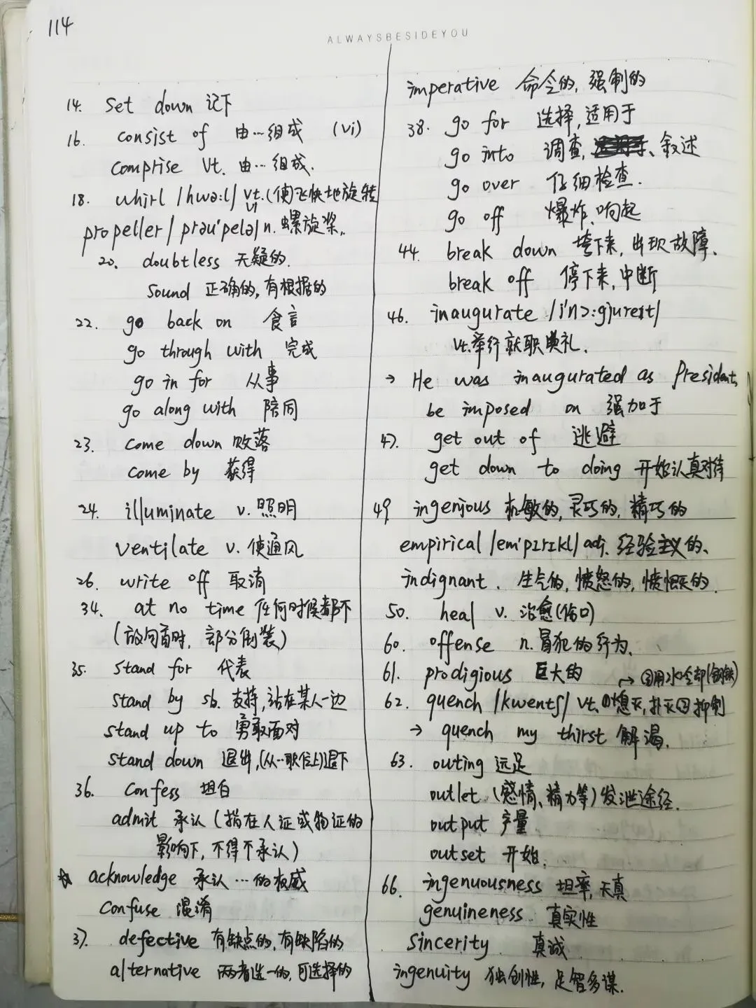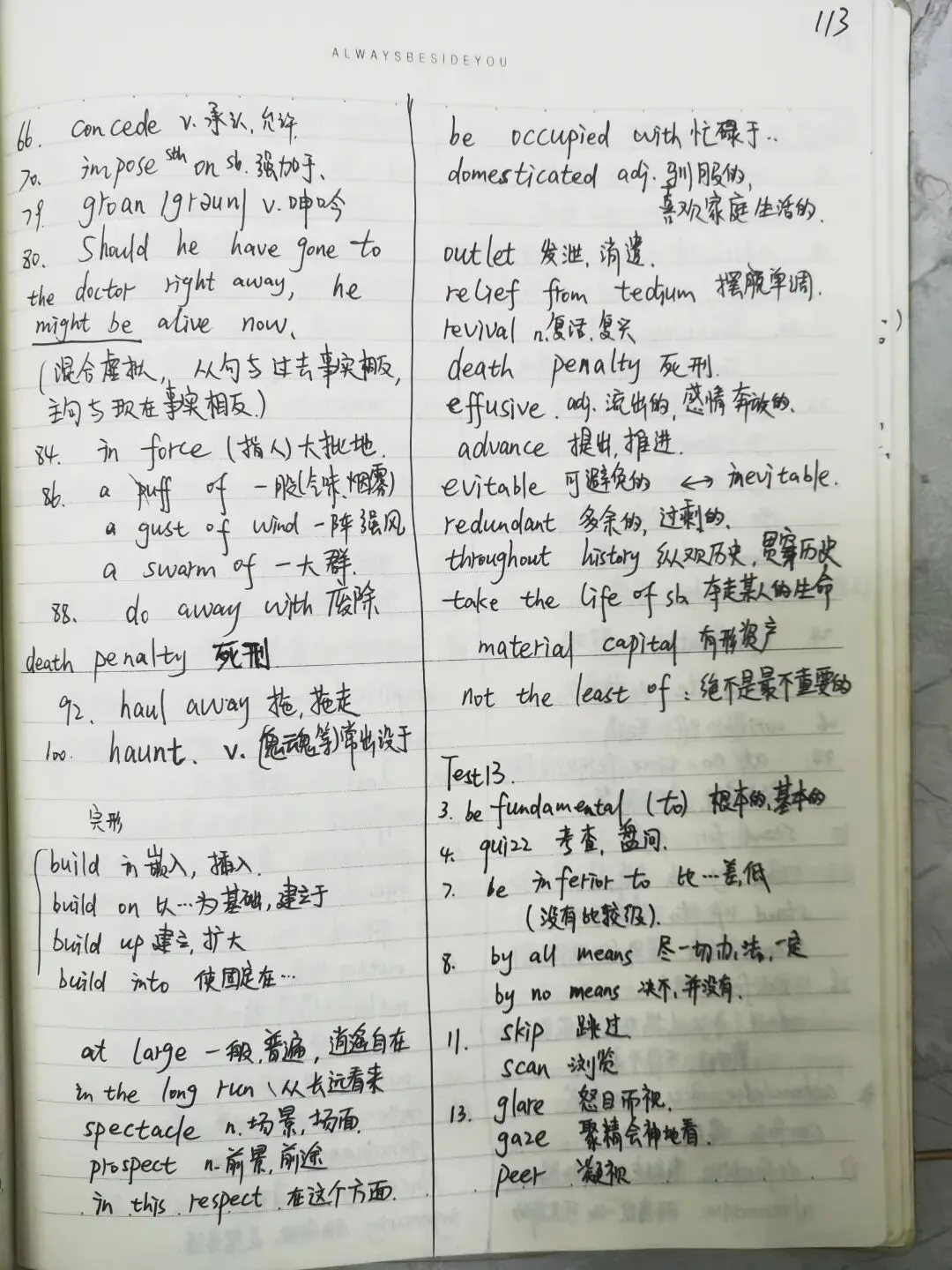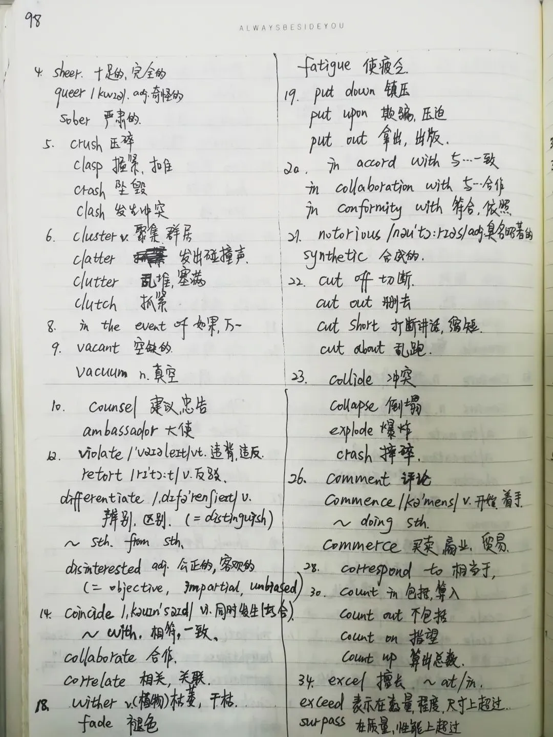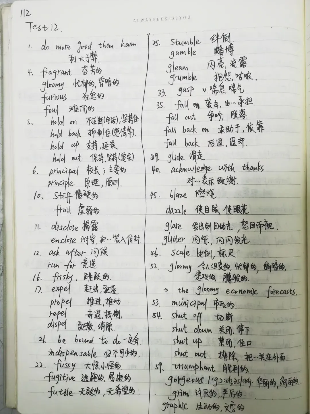 回想自己当年读大学的经历,记笔记是我一直坚持的习惯——这个习惯是我从小学四五年级就开始养成的。初高中时候,我只记录语文和英语笔记,数理化从来没有正式的笔记本,只在课本空白处简单记录一些知识点和解题思路。到了大学,来到英语专业,学习的专业课程都与英语密切相关——综合英语、高级英语、英语泛读、英语听力、英语笔译、英语口译。当然,我们专业的学生还要学习《高等数学》上册和几门外贸相关课程。遗憾的是,外国语学院居然不开设任何汉语课程,而教学楼里却赫然张贴着“学好外国语,做好中国人”的标语,这真是太搞笑了。从小学开始,我就习惯了阅读背诵历朝历代的诗词歌赋、散文、小说、议论文、说明文等各种体裁的文学作品。到了大学,《语文》这门学了十几年的课程突然不学了,实在有些难以接受。郁闷之余,我只好自己前往图书馆,借阅一些中国近现代文学作品,聊以打发周末闲暇时光。本期文章整理了笔者大学英语专业本科阶段备考专四专八的刷题笔记(拍照,笔记本第85页至第116页,共32页),涉及语法知识点、词汇辨析、短语用法等,可供备考大学英语四六级、专四专八、考研英语的学生和其他英语学习者学习使用。