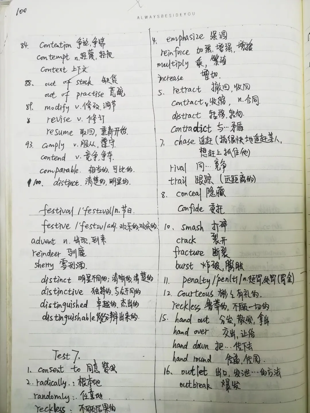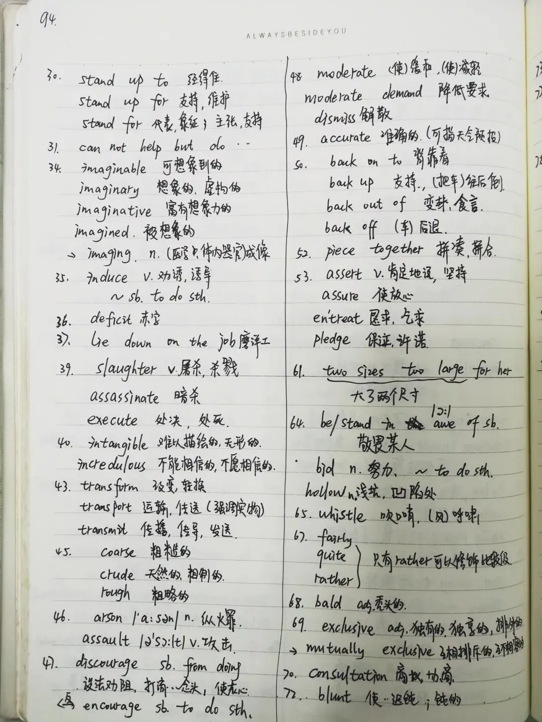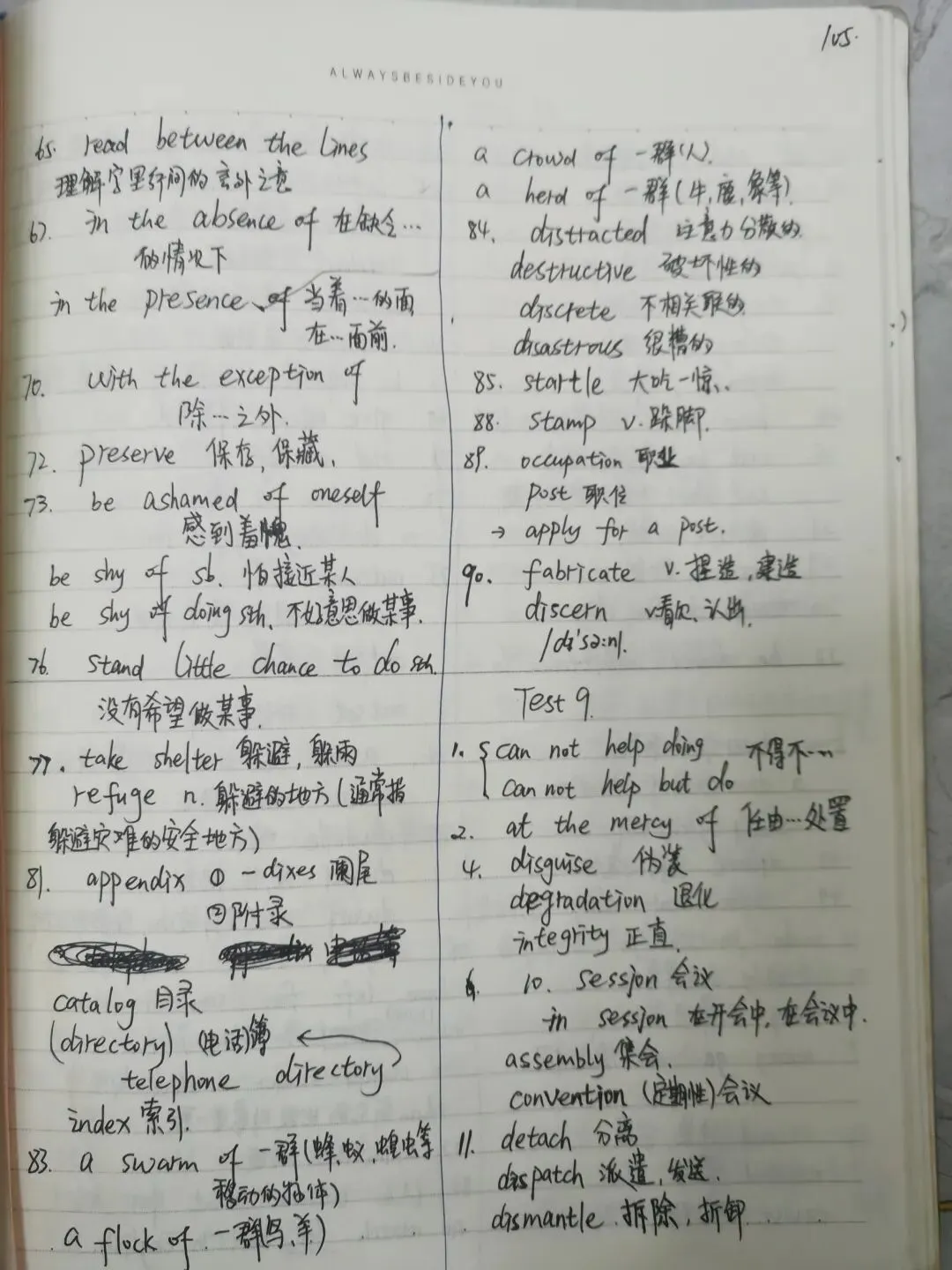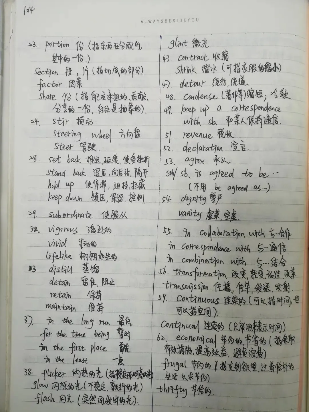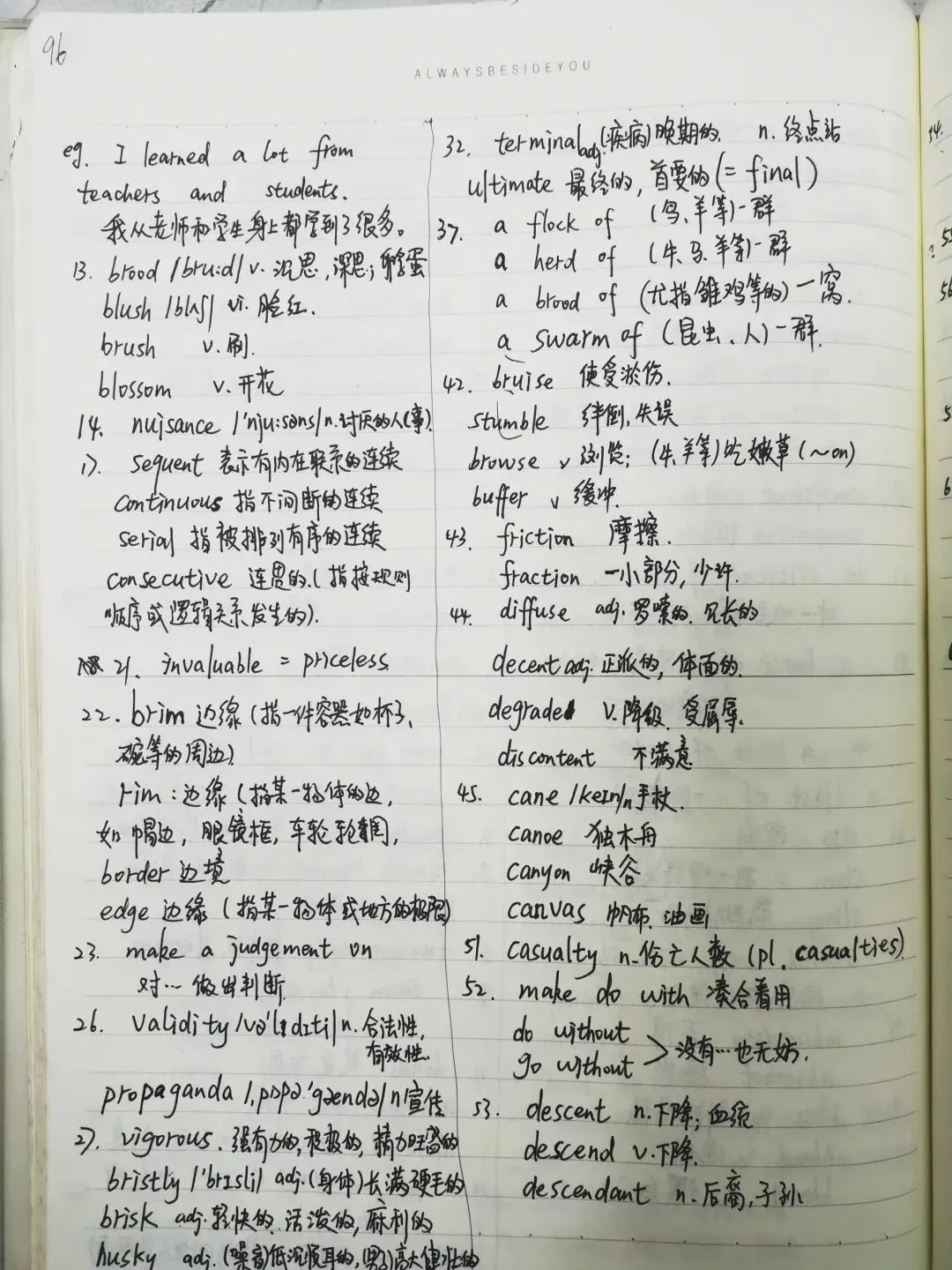 回想自己当年读大学的经历,记笔记是我一直坚持的习惯——这个习惯是我从小学四五年级就开始养成的。初高中时候,我只记录语文和英语笔记,数理化从来没有正式的笔记本,只在课本空白处简单记录一些知识点和解题思路。到了大学,来到英语专业,学习的专业课程都与英语密切相关——综合英语、高级英语、英语泛读、英语听力、英语笔译、英语口译。当然,我们专业的学生还要学习《高等数学》上册和几门外贸相关课程。遗憾的是,外国语学院居然不开设任何汉语课程,而教学楼里却赫然张贴着“学好外国语,做好中国人”的标语,这真是太搞笑了。从小学开始,我就习惯了阅读背诵历朝历代的诗词歌赋、散文、小说、议论文、说明文等各种体裁的文学作品。到了大学,《语文》这门学了十几年的课程突然不学了,实在有些难以接受。郁闷之余,我只好自己前往图书馆,借阅一些中国近现代文学作品,聊以打发周末闲暇时光。本期文章整理了笔者大学英语专业本科阶段备考专四专八的刷题笔记(拍照,笔记本第85页至第116页,共32页),涉及语法知识点、词汇辨析、短语用法等,可供备考大学英语四六级、专四专八、考研英语的学生和其他英语学习者学习使用。