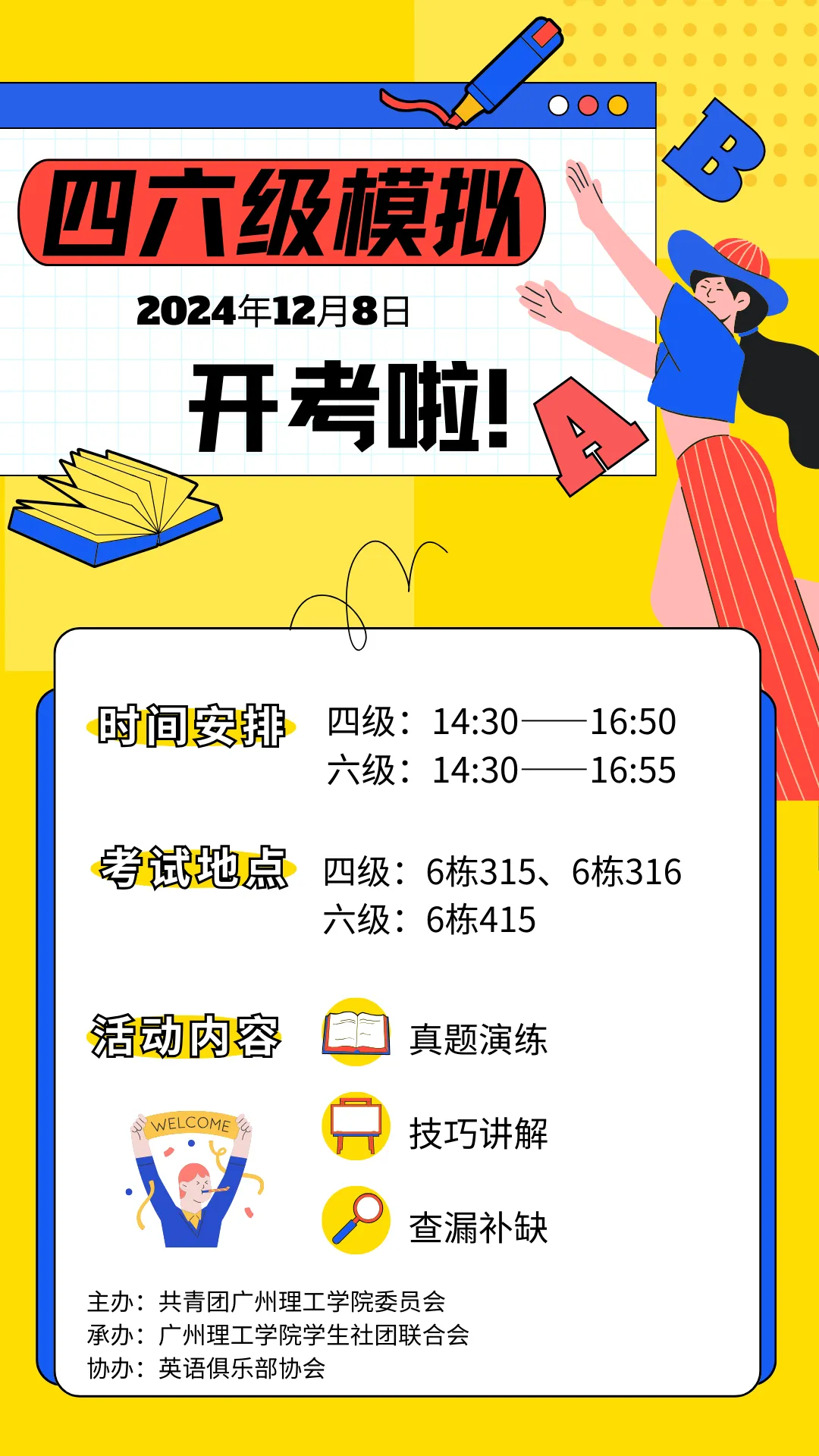2024年下半年全国大学生英语四六级考试将于12月14日举行,为帮助同学们更好地适应考试节奏,提升应试能力,英语俱乐部将于2024年12月8日,在6栋315、6栋316、6栋415教室精心组织一场英语四六级模拟考试。此次模拟考试面向全体在校学生,旨在为同学们提供一次实战演练的机会,能够提前熟悉四六级考试的流程、题型与时间安排,从而更有针对性地进行备考。